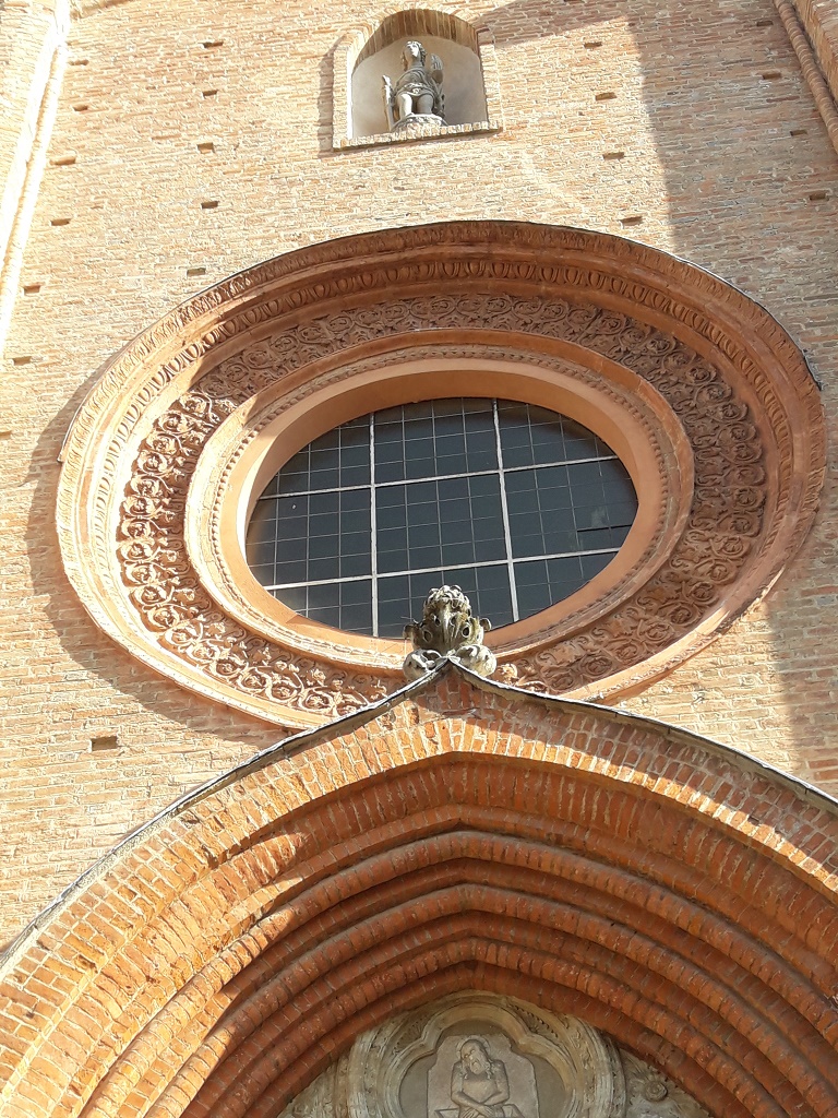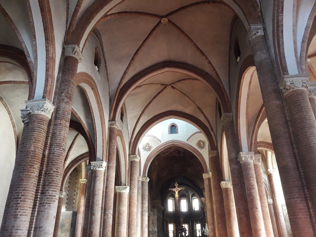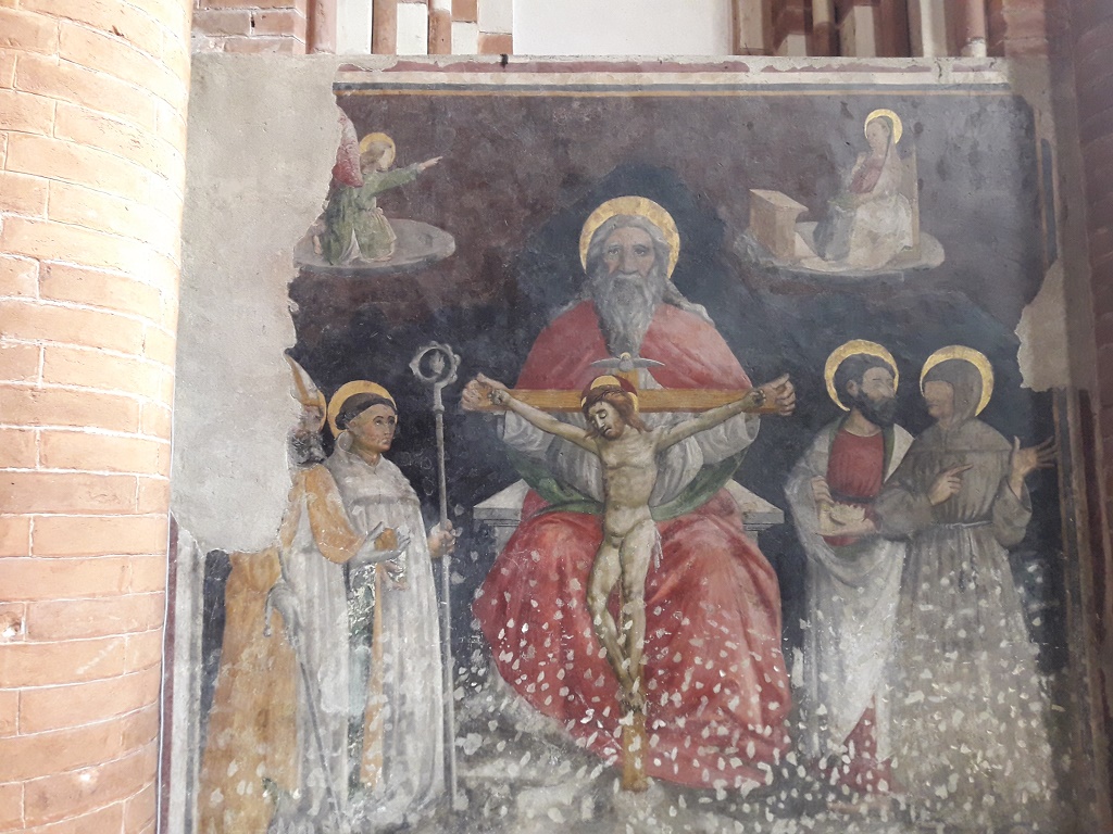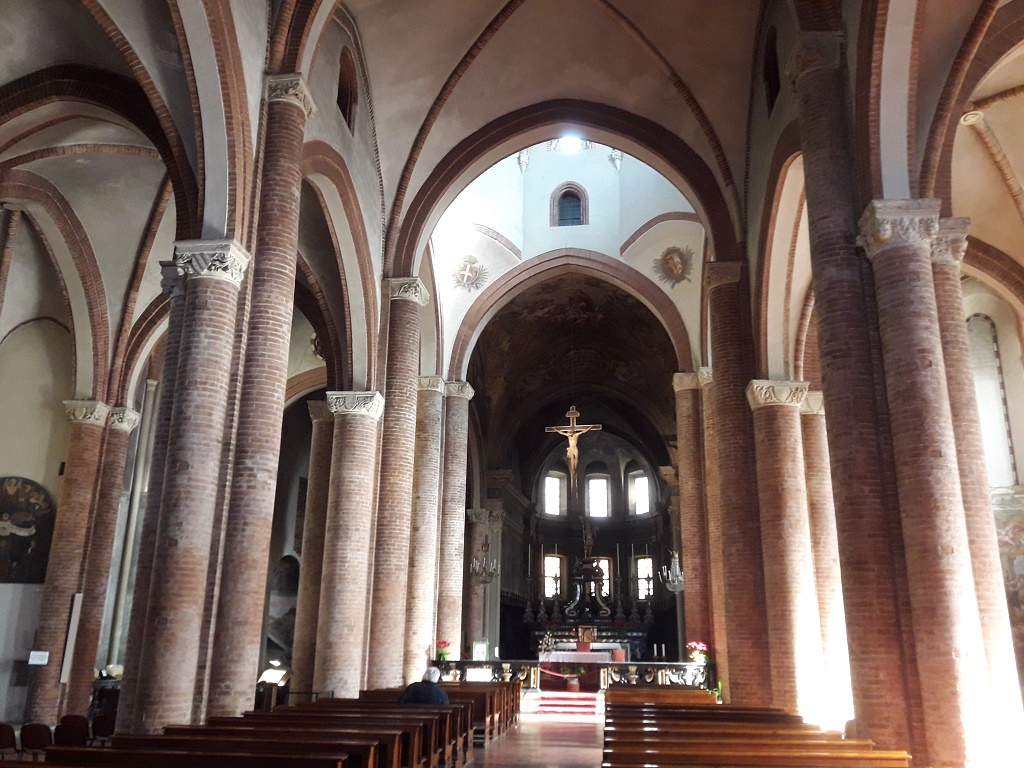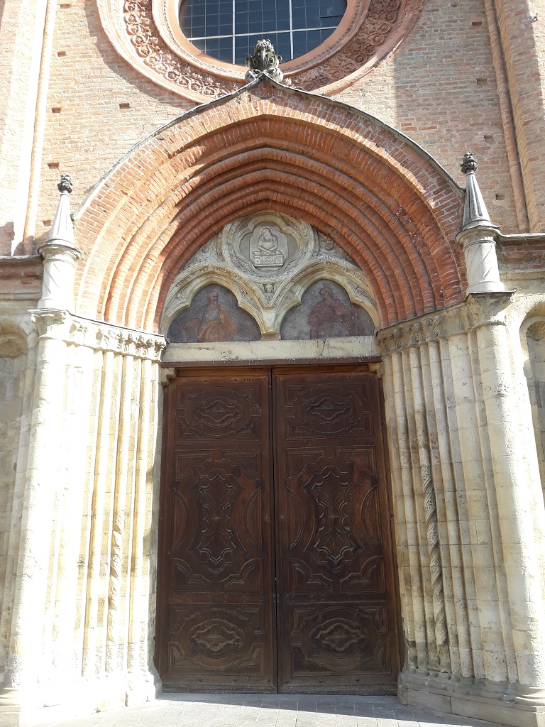 Esterno: facciata tripartita da due lesene con tre portali gotici con capitelli scolpiti; sopra il centrale una lunetta con scolpito Cristo che risorge dal sepolcro, bassorilievo del '400. Tra i portali corre un motivo di alte e strette arcatelle, al centro un grande rosone in cotto ornato da motivi a fogliami e ai lati due rosoni più piccoli. La statua del santo è una copia dell'originale trecentesco. Il fianco destro presenta cappelle dagli spigoli rafforzati da contrafforti. In alto il tiburio ottagonale è coronato da un doppio giro di archetti pensili e motivi geometrici in laterizio. Nella parte absidale si conserva originaria l'abside centrale del '200. Nella parte absidale si è conservata originaria solo l'abside centrale. |
