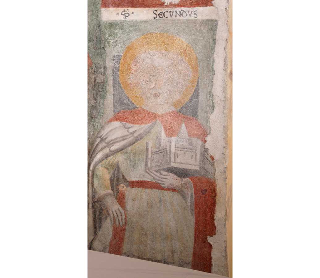 Cripta: vi si accede da due scale ai lati del presbiterio. Si tratta della cripta dell'originaria chiesa di San Secondo del X secolo. Fu ampliata nel '500 e molto manomessa; si presenta a tre navatelle divise da colonnine di arenaria e termina con una abside in cui è custodita la cassa d'argento, cinquecentesca, contenente le reliquie di San Secondo. |