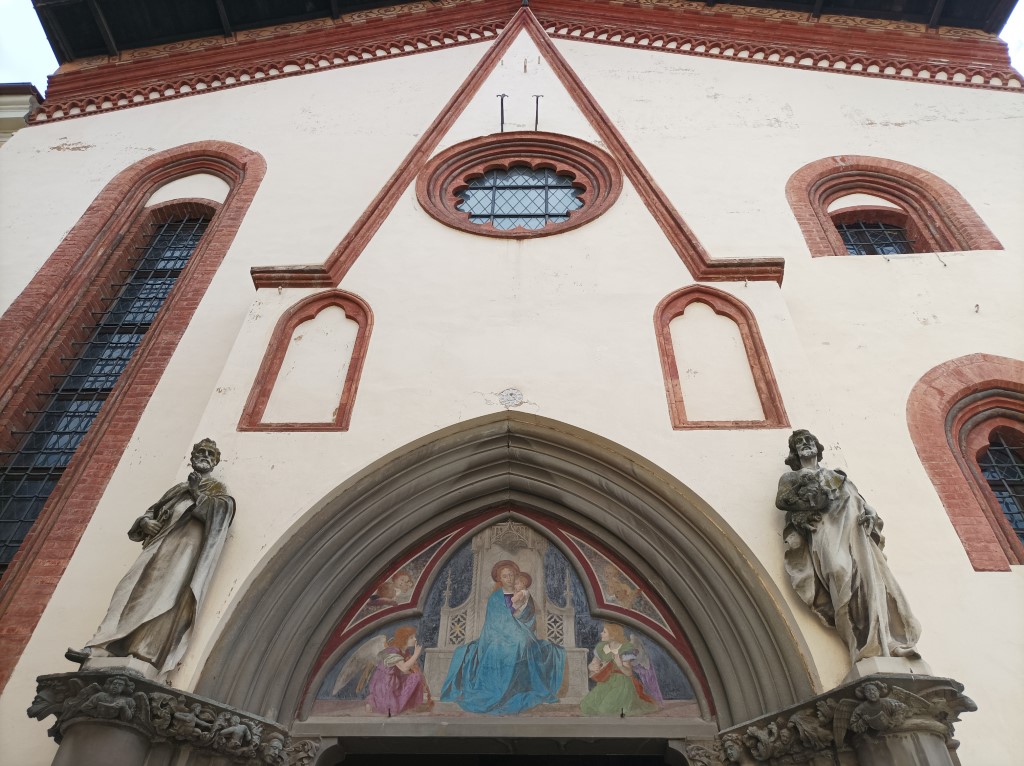 Esterno: la facciata del XV secolo ha un fregio in cotto ad archetti intrecciati; sopra il portale, ricostruito in epoca moderna, si trova una alta ghimberga con statue. A sinistra del portale una monofora ogivale e a destra tre monofore ogivali sovrapposte. |