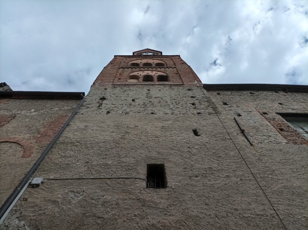 Campanile: trecentesco, si leva sul fianco destro. È ornato da bifore e trifore e, sopra la cella campanaria, di piatti in maiolica decorata. Lo corona una cuspide piramidale. |