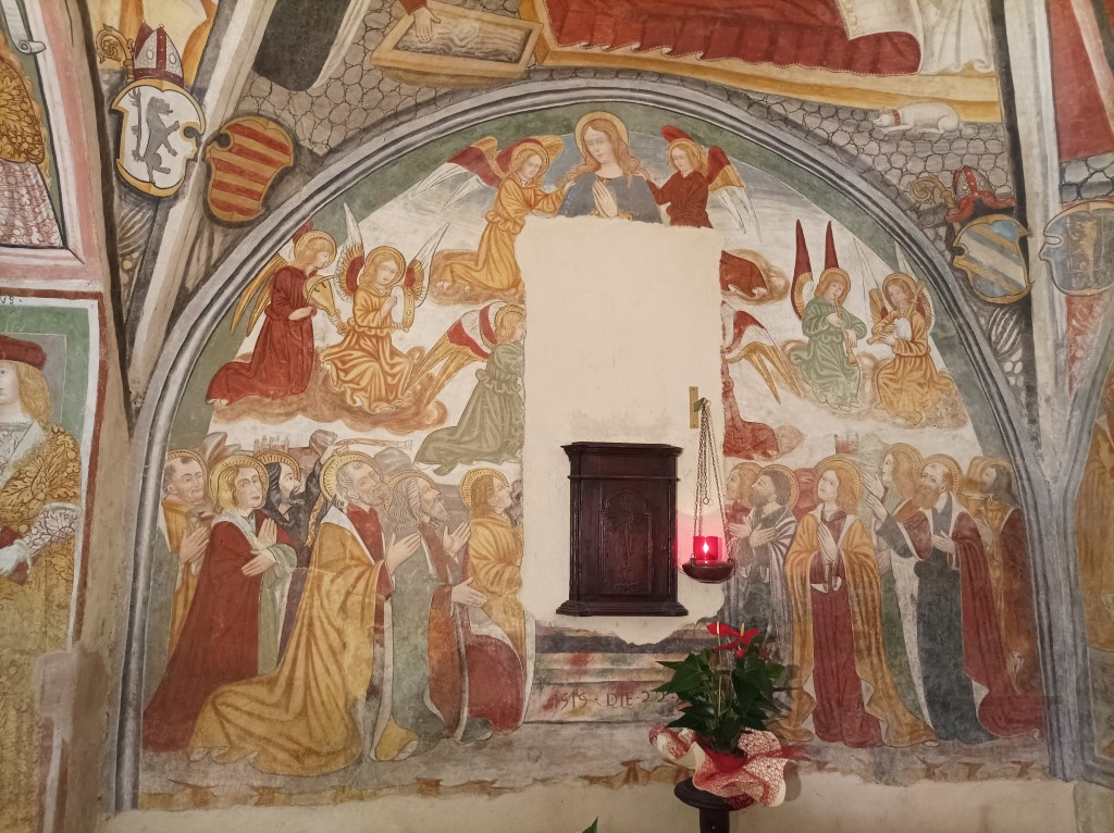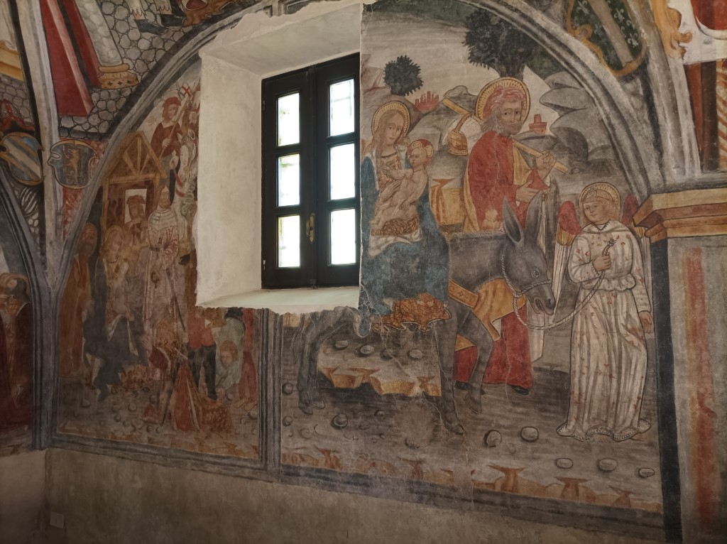 Interno: affreschi del tardo 400 coprono parte dell'interno, a tre navate con volte a crociera divisa da bassi pilastri. Vi sono rappresentati Storie di Maria e del Redentore nelle vele e medaglioni con profeti nei sottarchi, interessanti per i costumi medioevali e attribuiti alla cerchia del De Bosis (notizie 1497-1528). |