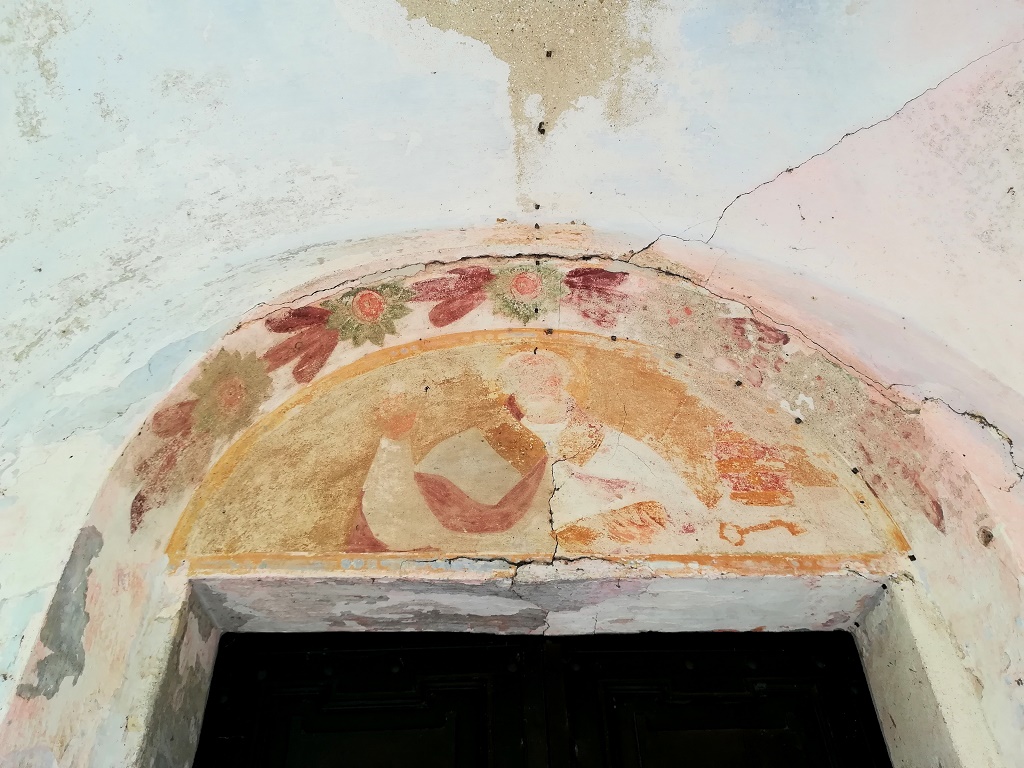 Esterno: affresco di San Cristoforo in facciata datato 20 settembre 1460. Sul fianco destro archetti ogivali del rifacimento del '400. |