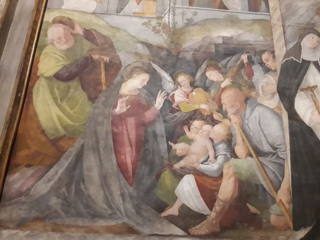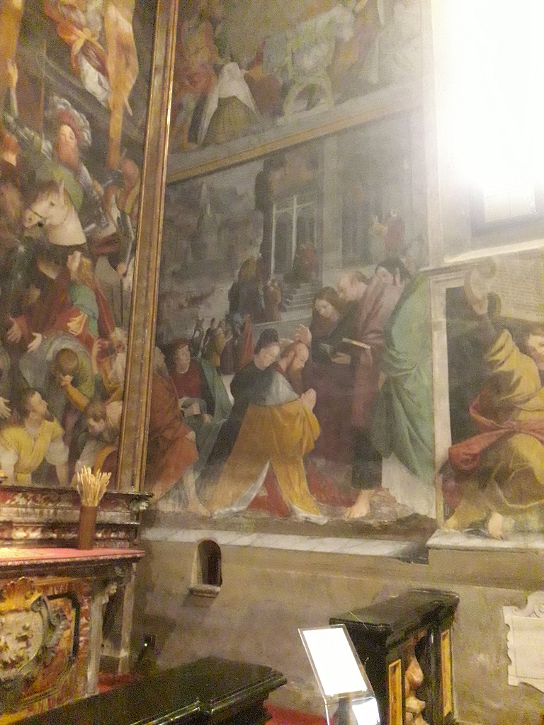 Interno: ciclo di affreschi rinascimentali, opera di Gaudenzio Ferrari (1477-1546) che li dipinse tra il 1529 e il 1534. Nella cappella della Maddalena, a destra del presbiterio, sopra l'altare, Crocifissione e alla parete laterale episodi della leggenda di Maria Maddalena, di cui alcuni riquadri sono stati danneggiati dalle cannonate spagnole nell'assedio del 1638 (Gesù predicante, Noli me tangere, Assunzione della Santa), restano ben conservati Maria Maddalena ai piedi di Gesù, Marta e Maria Maddalena al sepolcro, Maria Maddalena Marta e Lazzaro che accolgono i principi di Marsiglia di ritorno dalla Palestina, Morte della Santa benedetta dal Vescovo Massimino, un angelo con una lunga iscrizione che illustra la leggenda e il committente, Giovanni Angelo Corradi di Lignana, ritratto in preghiera in basso nella crocefissione. Nella cappella dell'Assunta, a sinistra del presbiterio, su commessa di Andrea Corradi di Lignana, affreschi del 1533-34 con storie della vita di Maria: sopra l'altare Assunzione, alle pareti laterali Santa Caterina da Siena, e San Niccolò con due devote, l'Annuncio ad Anna e Gioacchino, la Presentazione al Tempio, la Visitazione, la nascita e matrimonio di Maria, l'adorazione di Gesù e l'arrivo dei Re Magi. In fondo all'abside tavola del 1529 raffigurante la Madonna degli Aranci fra i Santi Cristoforo, Giovanni battista, Giuseppe, Nicola da Bari, un beato e il fondatore della chiesa Nicolino Corradi. |