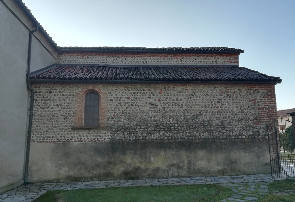 Esterno: costituito da corsi orizzontali regolari di ciottoli disposti a lisca di pesce presenta la parte absidale in mattoni di epoca più tarda. |