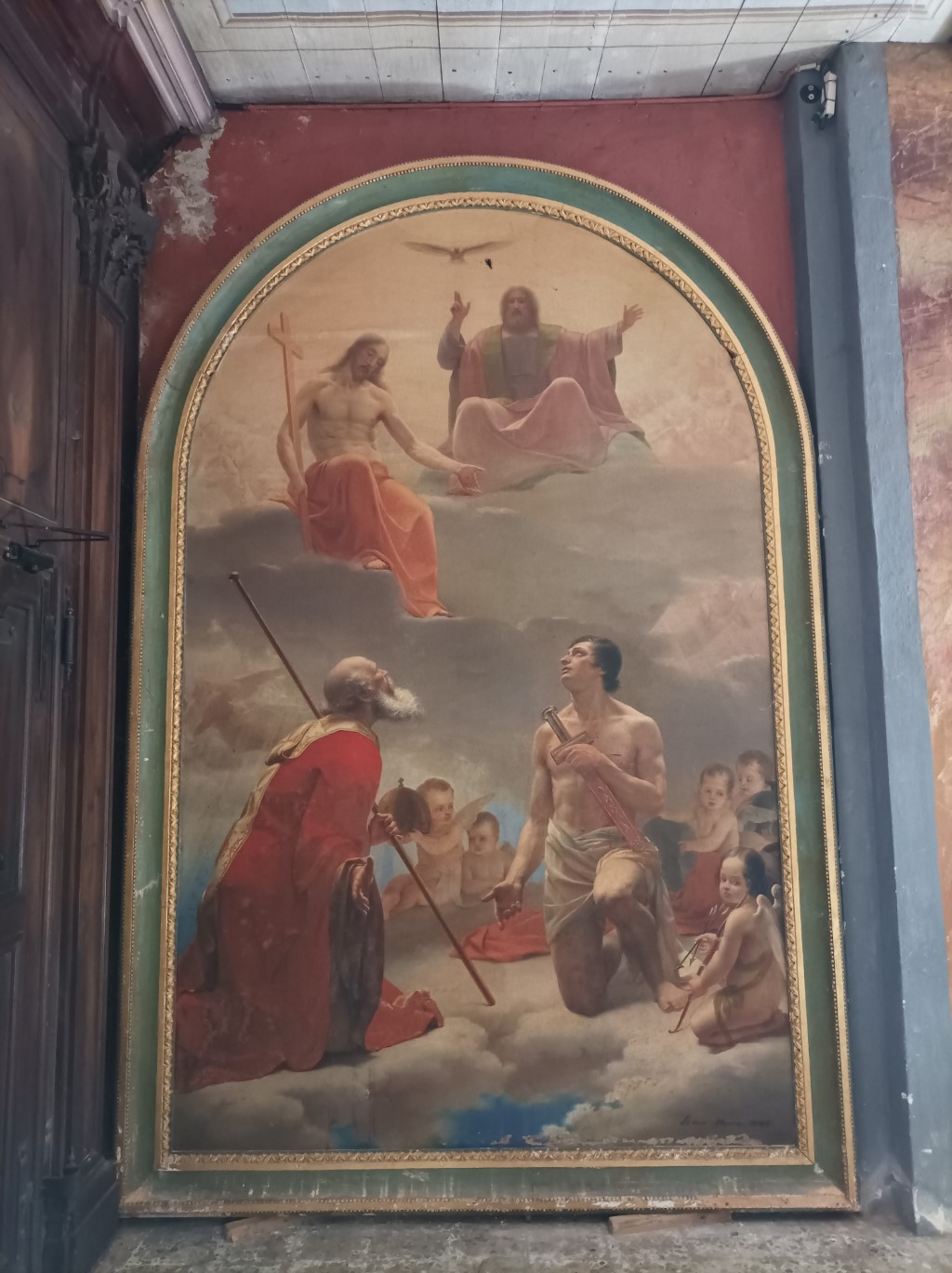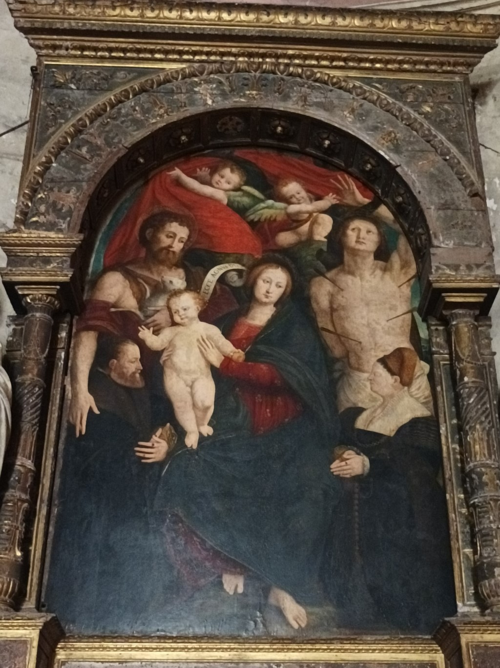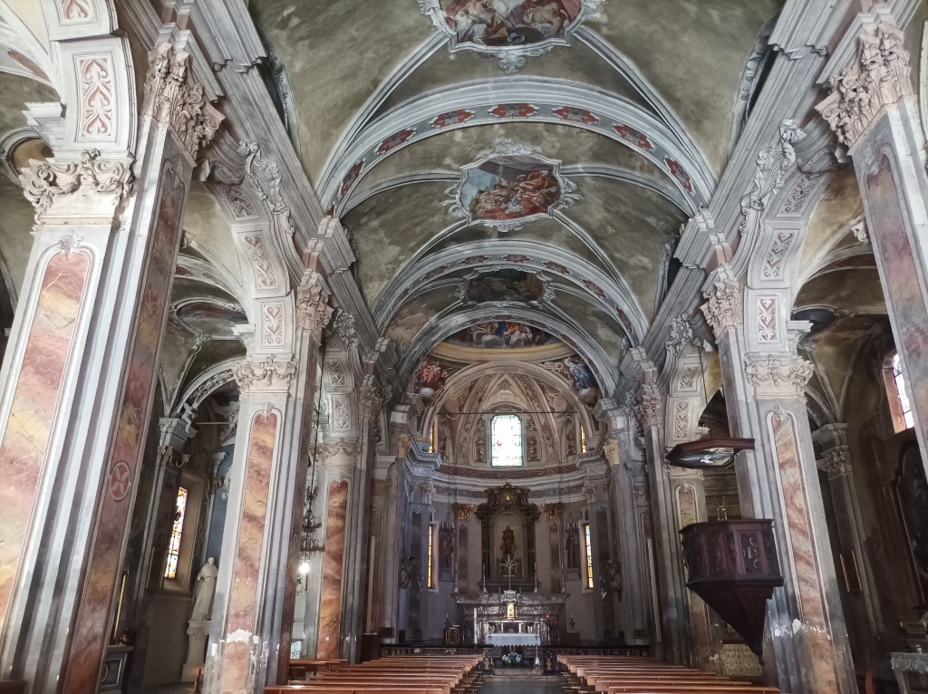 Interno: conserva tra le opere, all'altare una tela attribuita alla scuola di Gaudenzio Ferrari rappresentante la Madonna col bambino e i Santi Giovanni Battista e Sebastiano e donatori. |