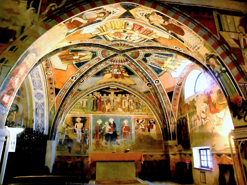 Interno: coperto di affreschi del genere tardo gotico di derivazione provenzale, probabilmente dovuti a più mani. Gli affreschi, esclusi quelli del presbiterio, sono suddivisi in 51 quadri incorniciati spesso da bellissime grottesche e rappresentano gli episodi principali del nuovo testamento della vita di San Fiorenzo, della vita di Sant'Antonio Abate. Alla parete d'ingresso 7 riquadri narrano scene della vita di Maria e di Gesù, traendo spunto anche dai vangeli apocrifi, inoltre u riquadro raffigura San Lazzaro e uno una nobildonna. Alla parete destra in 12 scomparti storie di Sant'Antonio datate 1472 forse assegnabili a Giovanni Mazzucco (notizie intorno al 1451), con, nell'ultimo riquadro, la scritta in caratteri gotici "hoc upus fecit fieri facius turrinus" che data il ciclo di affreschi "1427, 27 giugno, quest'opera fece fare Bonifacio della Torre. Seguono i vizi e le virtù (di evidente influenza di Giacomo Jaquerio); la raffigurazione del Paradiso o Gerusalemme celeste vede, accanto alla Vergine incoronata, accolte le anime di quanti compiono sulla terra le prescritte sette opere di misericordia e perseguono la strada della virtù; la cavalcata dei vizi con l'inferno rappresentata dal drago infernale che inghiotte le anime dei dannati in un mondo dominato da torture e dolore; da notare, tra gli altri gli avvocatores e i procuratores condannati dalla gente di Bastia alla dannazione eterna. Seguono le storie di San Fiorenzo, in 9 riquadri, raffigurato come martire della legione Tebea ed evangelizzatore. Sulla parete di sinistra in 21 (o 22?) riquadri si narra la Passione, Morte e Resurrezione di Cristo. Ai lati dell'arco santo a destra la Vergine annunziata e San Francesco d'Assisi, a sinistra San Domenico, nel sottarco Santa Chiara, Santa Caterina e San Giovanni Battista. Nel presbiterio alla parete di destra San Giorgi che uccide il drago; sulla parete di fondo San Sebastiano, Madonna col Bambino, i Santi Fiorenzo e Martino, San Michele con San Bartolomeo e Crocifissione; tutti affreschi del primo 1300. Sulla volta Cristo benedicente e i quattro Evangelisti. |
