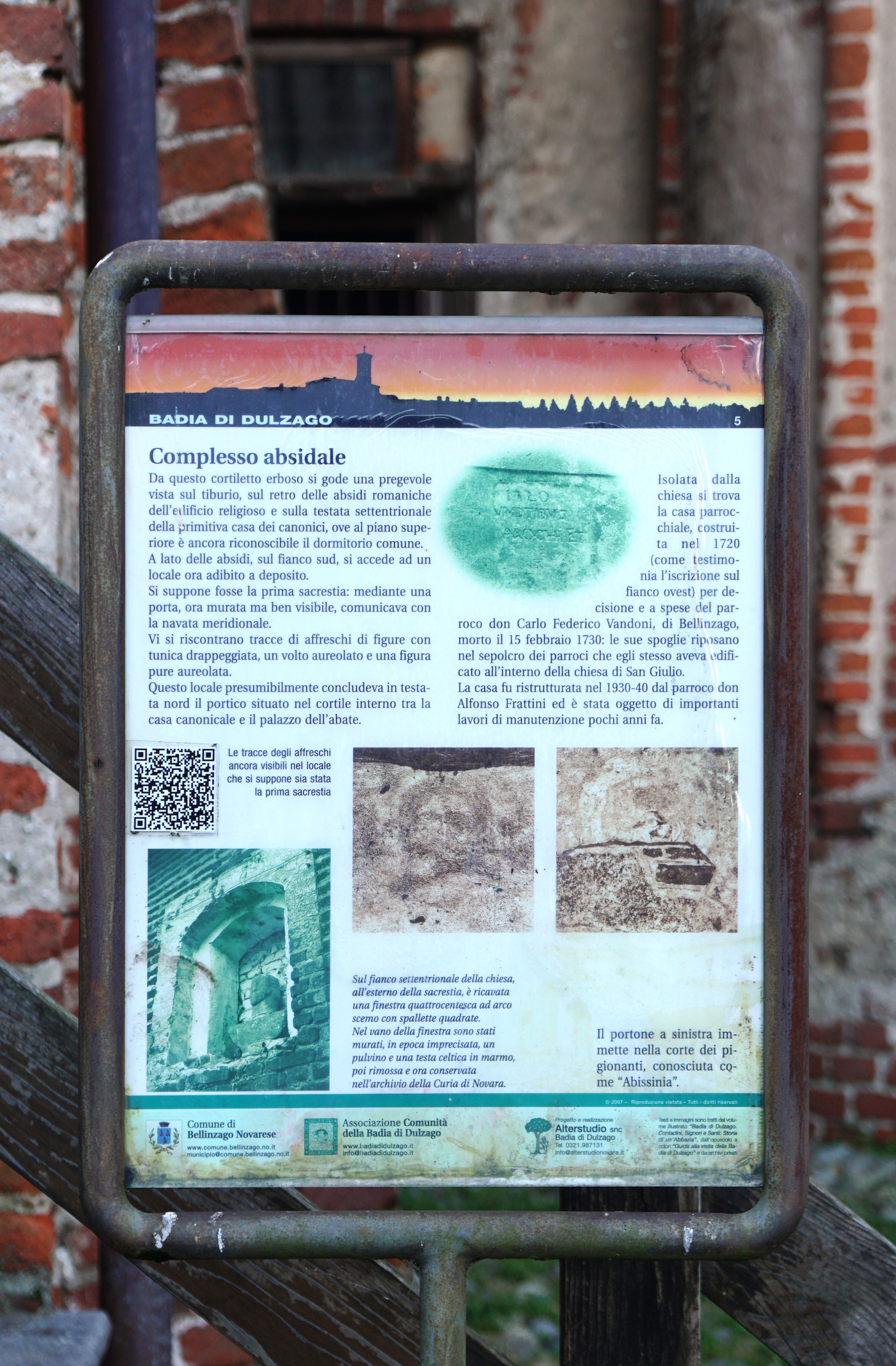 La Chiesa o Canonica Regolare si trova a Badia di Dulzago, Bellinzago Novarese (NO), nota come San Giulio. Periodo prevalente: XII secolo. Livello di interesse: 2 (Merita una deviazione). Elementi presenti: architettura, pittura. Da vedere: esterno, interno.