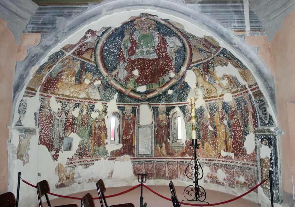 Interno: la cappella di sinistra, abside originaria, conserva un ciclo di affreschi del '400 con Cristo nella Mandorla e Teoria di Apostoli. |