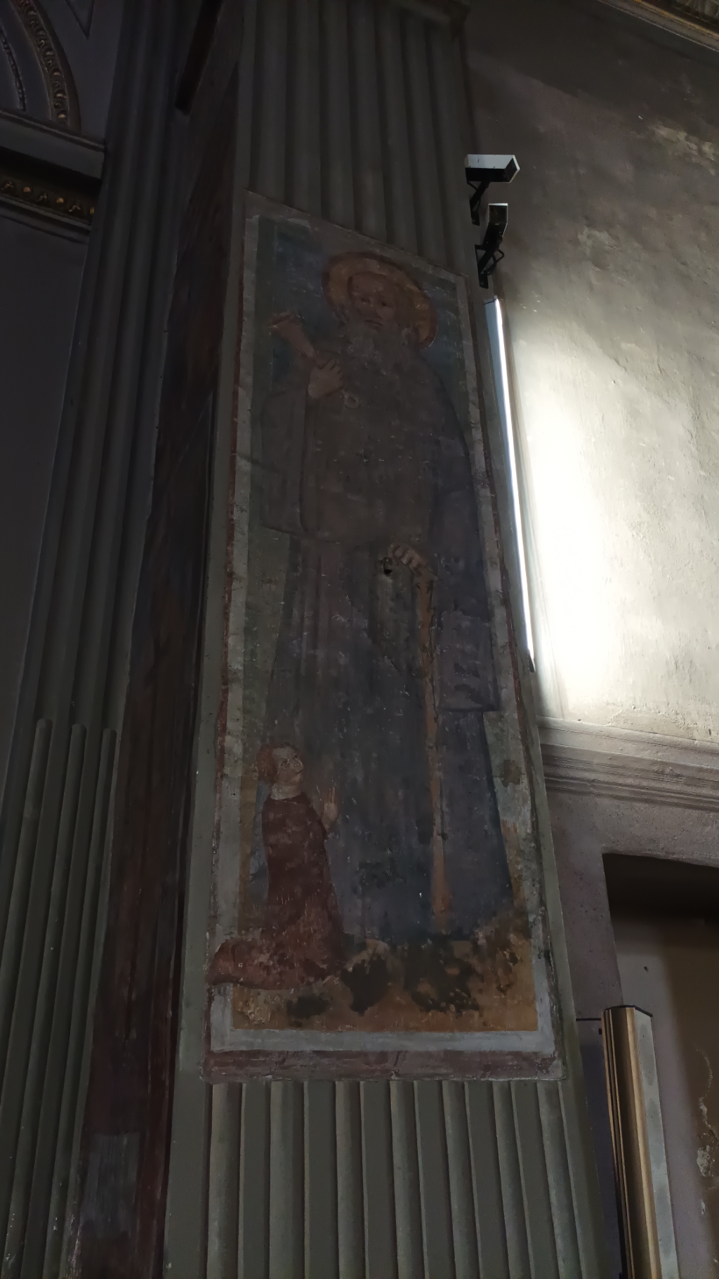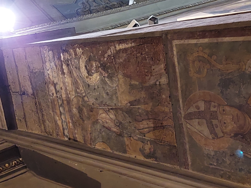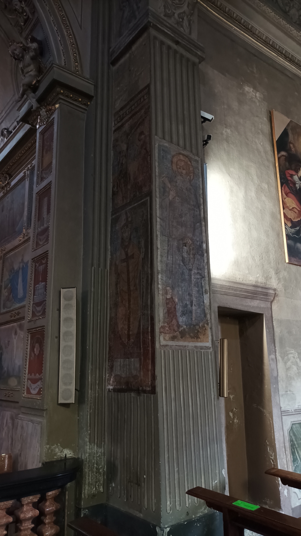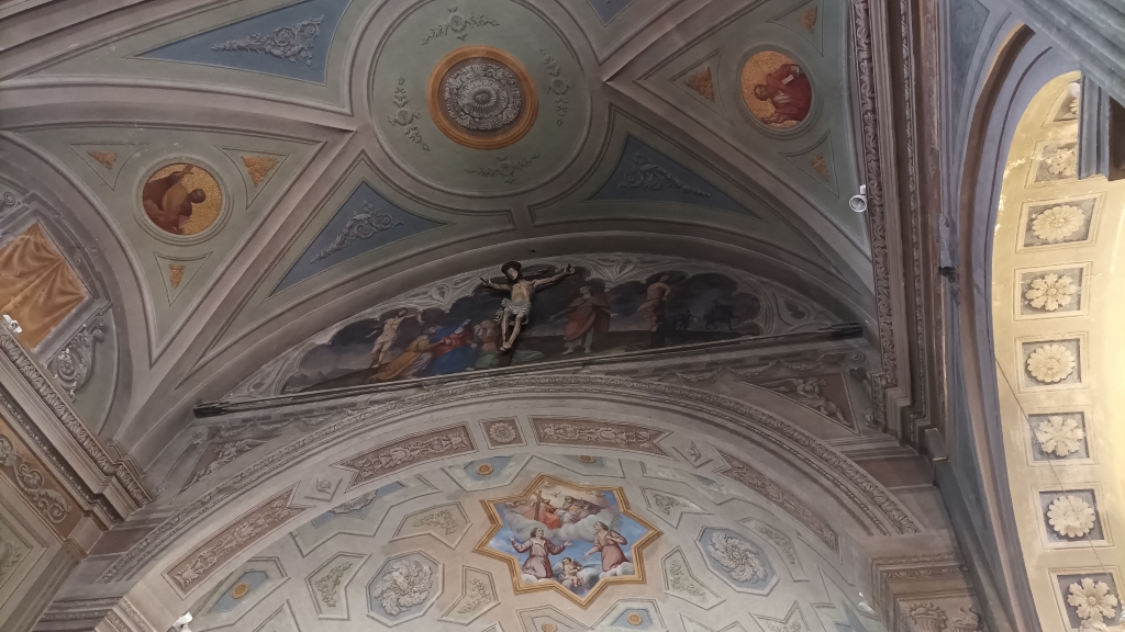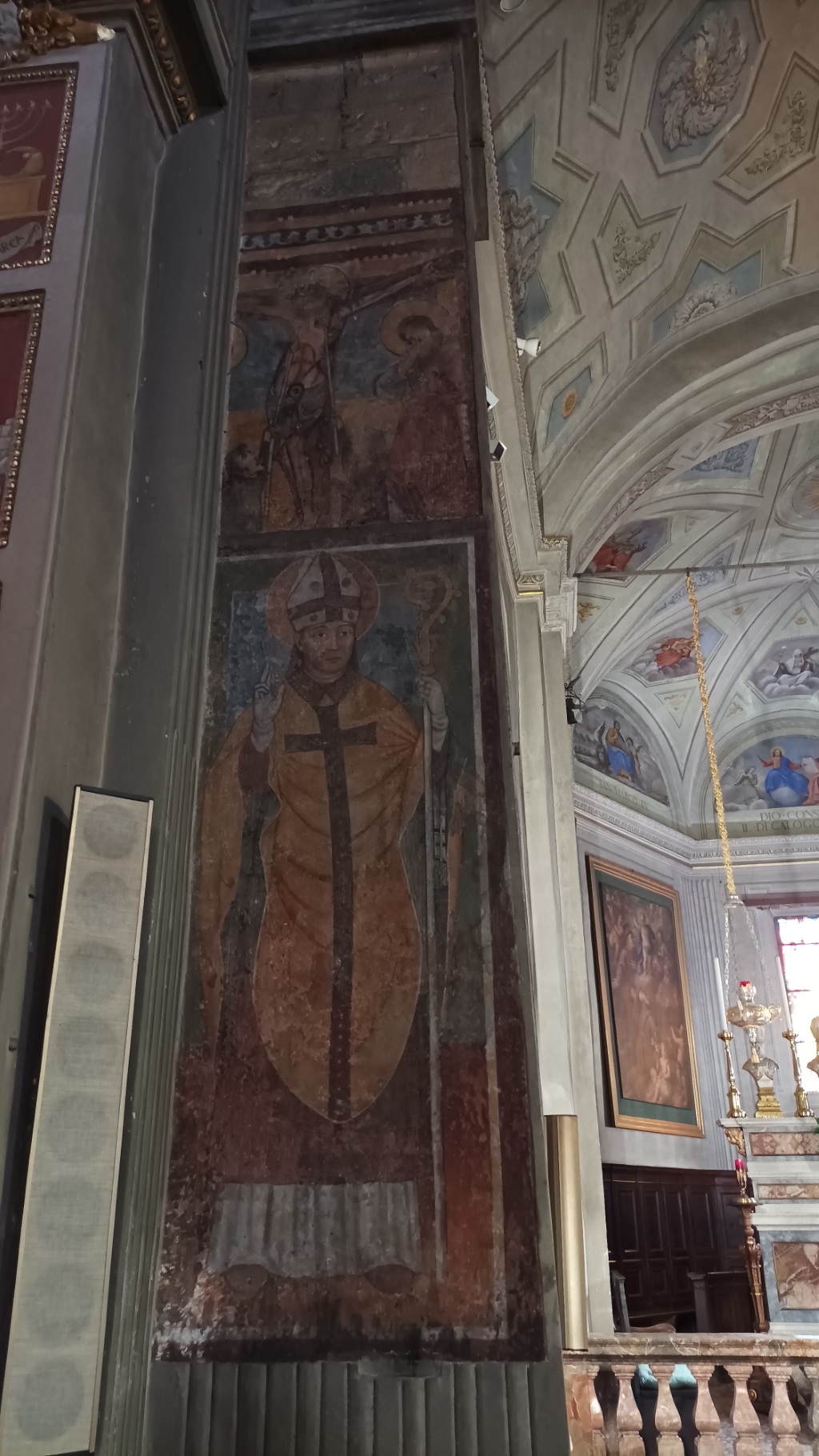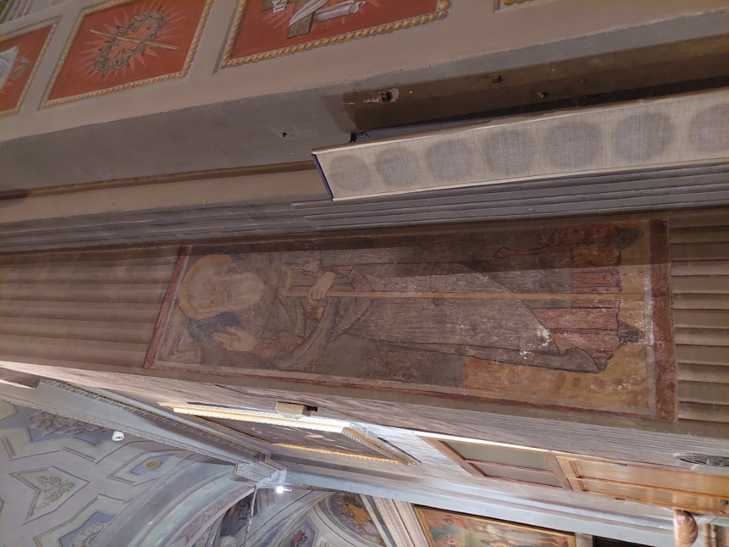 Interno: sui pilastri dell'arco santo affreschi trecenteschi e romanici, in alto crocifisso ligneo del XV secolo. |