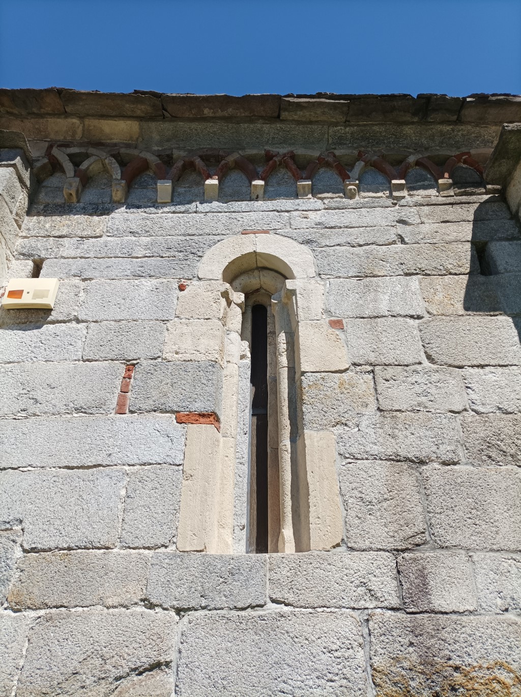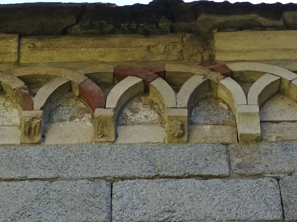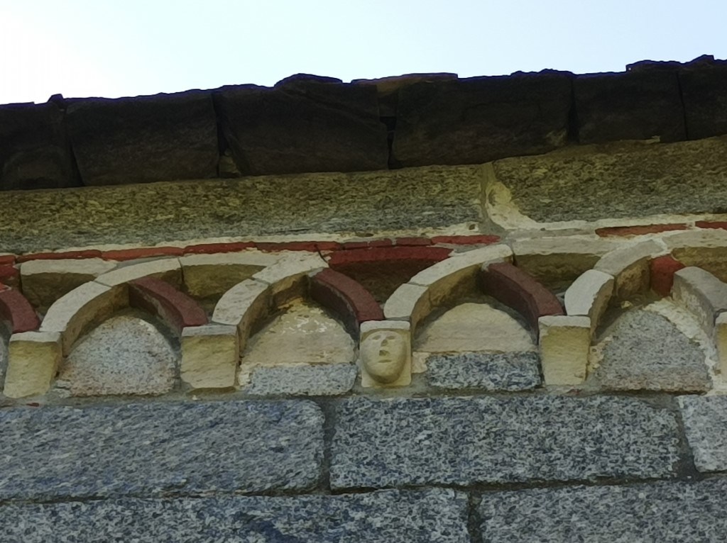 Esterno: in granito con abside semicircolare adorna di loggetta; monofore strombate e archetti pensili. All'incrocio del transetto tiburio ottagonale sormontato da lanterna. La muratura in pietra chiara si presenta a blocchi ben squadrati disposti su corsi orizzontali, ad eccezione dell'abside dove si presenta più irregolare. La facciata è aperta da un portale ad arco con lunetta priva di decorazione, sopra cui si apre una monofora a strombo modanato. Lungo il tetto corre un fregio di archetti pensili, poggianti su mensole lisce, realizzati alternativamente in cotto e in pietra. Lungo tutto il perimetro della chiesa è presente un fregio ad archetti, che nella navata poggiano su mensole scolpite con motivi a rosette e testine umane e di animali. Nell'abside gli archetti diventano un abbozzo di galleria. Sul tiburio ottagonale e sul fianco sud gli archetti si presentano intrecciati. Le finestre ad arco hanno una profonda strombatura modanata e si presentano alte e strette nel fianco sud, più proporzionate nell'abside e nel lato orientale del transetto. |