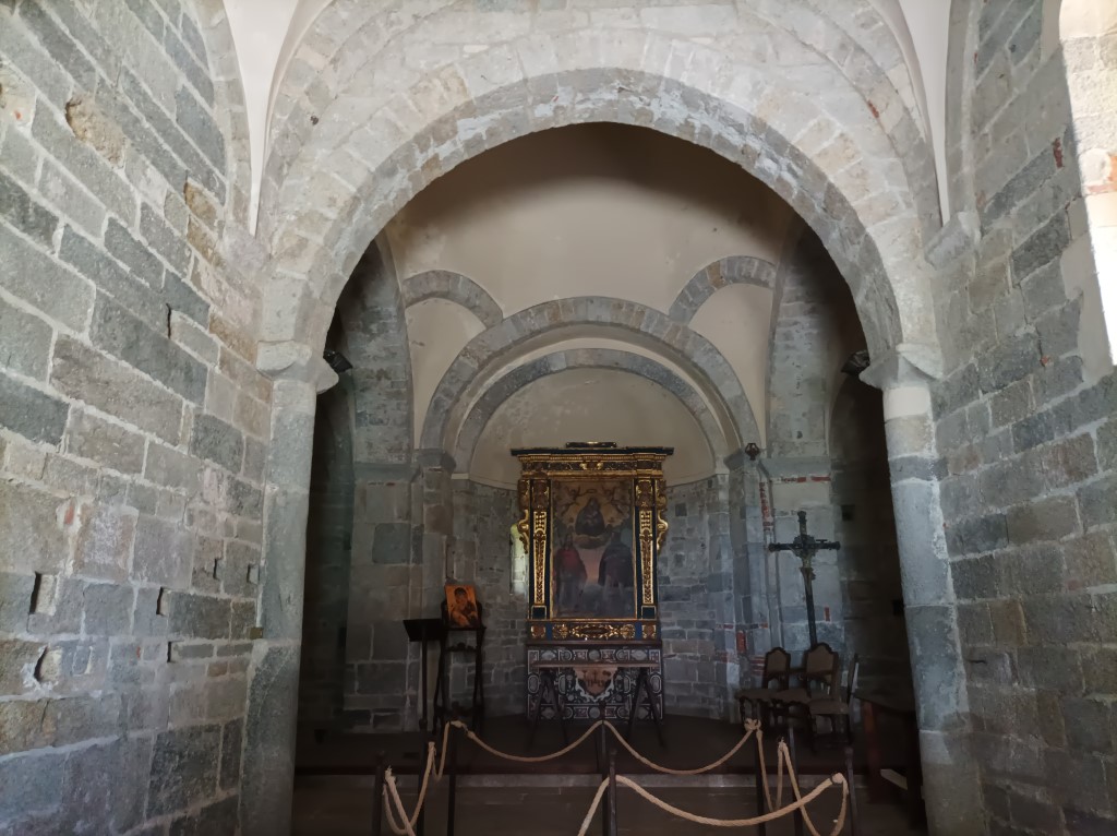 Interno: presenta una pianta a T con abside terminale, staccandosi pertanto sia dallo schema ad aula che da quello basilicale; la copertura è a volta con costoloni e, all'incrocio del transetto, cupola ottagonale spicchi su pennacchi. La navata è divisa in due campate da lesene con addossate semicolonne. Sugli spigoli delle lesene si impostano i costoloni mentre le semicolonne reggono gli archi trasversali. Anomala per l'architettura romanica del nord Italia l'abbondante presenza di mensole che reggono parti delle volte, in particolare dove queste si impostano su uno degli angoli esterni dell'edificio. |