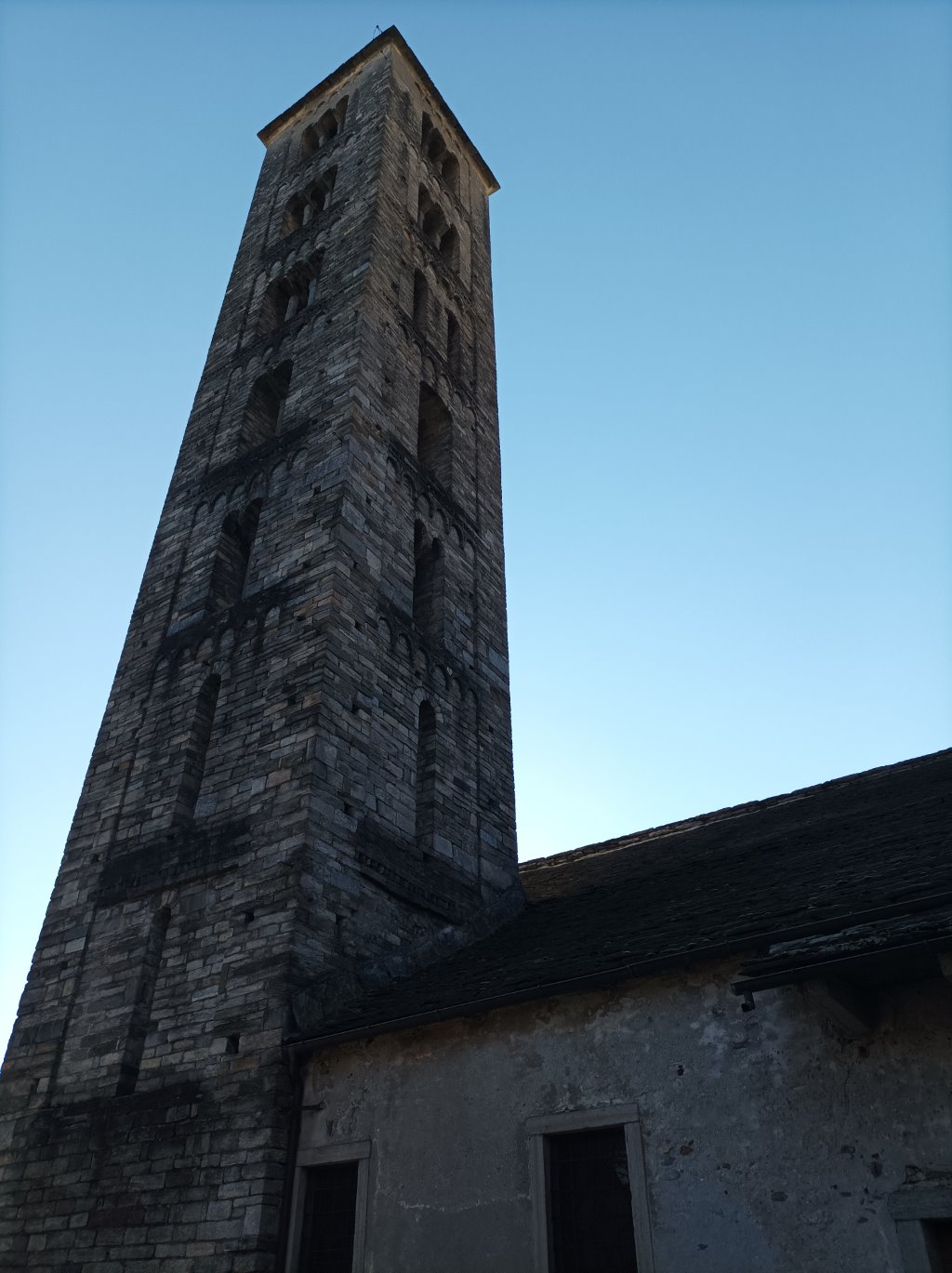 Campanile: romanico a 7 piani con sei serie di archetti pensili, fregi a dente di sega e monofore, bifore e trifore. |