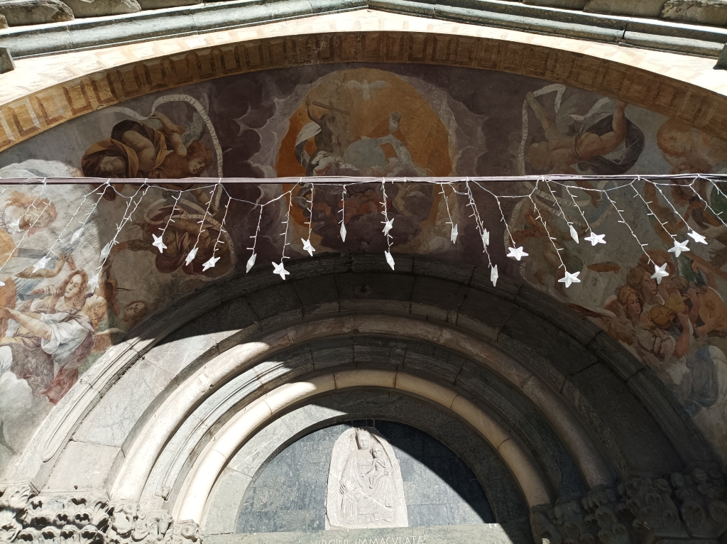 Esterno: ai lati del protiro sono gli affreschi di San Vitale e Santa Valeria con i gemelli San Gervasio e San Protasio attribuiti a Fermo Stella (notizie dal 1519-morto dopo il 1562). Sul fianco San Cristoforo. |