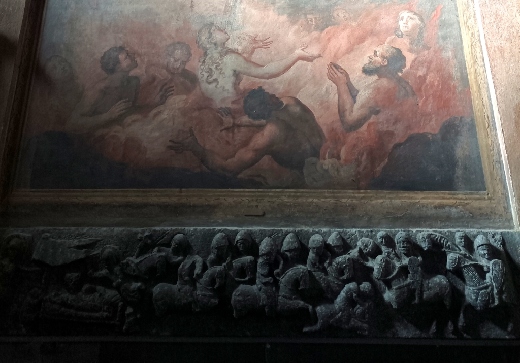 Interno: nella parete della prima campata sinistra è murato un altorilievo del XII-XIII secolo raffigurante storie della vita di Carlo Magno ispirate alla chanson de Roland. |