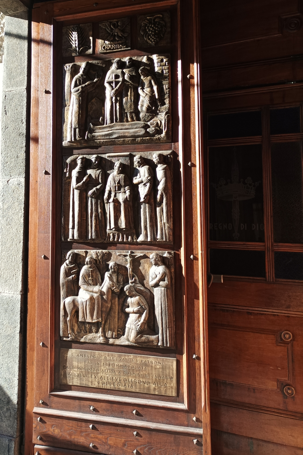 Notizie generali: nota sin dal 840, abbattuta durante il dominio visconteo per far spazio all'ampliamento del castello fu ricostruita tra il 1450 e il 1470 conservando il portale romanico dell'antico edificio ed aggiungendo verso il 1650 l'elegante protiro. Pericolante fu ristrutturata nel 1793 e completata con la facciata del 1954. Nell'interno neoclassico tela di Tanzio da Varallo (1575-1635) rappresentante San Carlo che comunica gli appestati. |