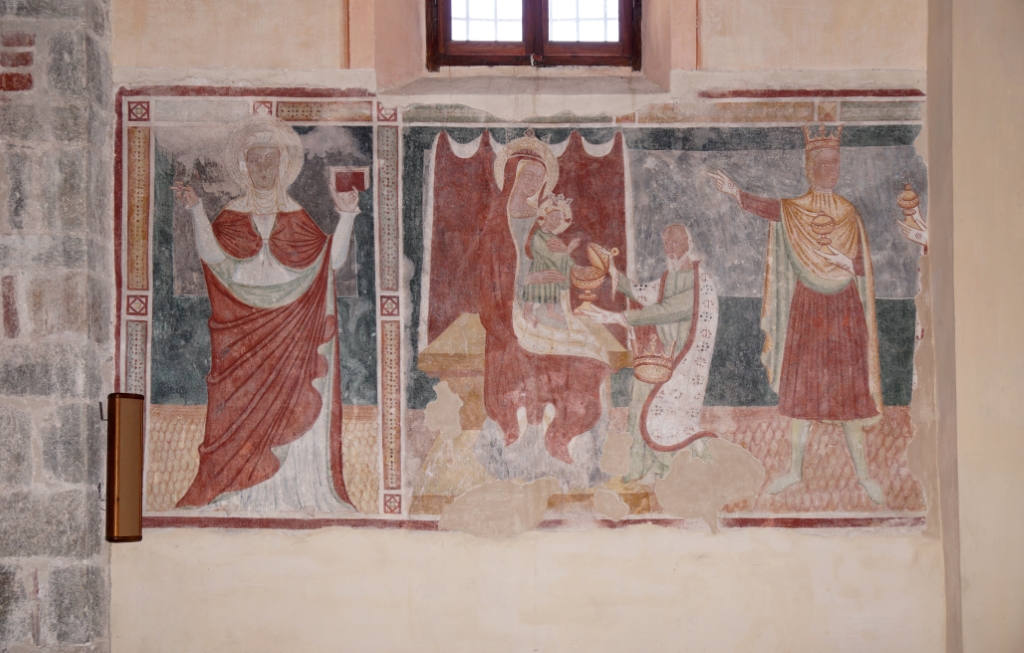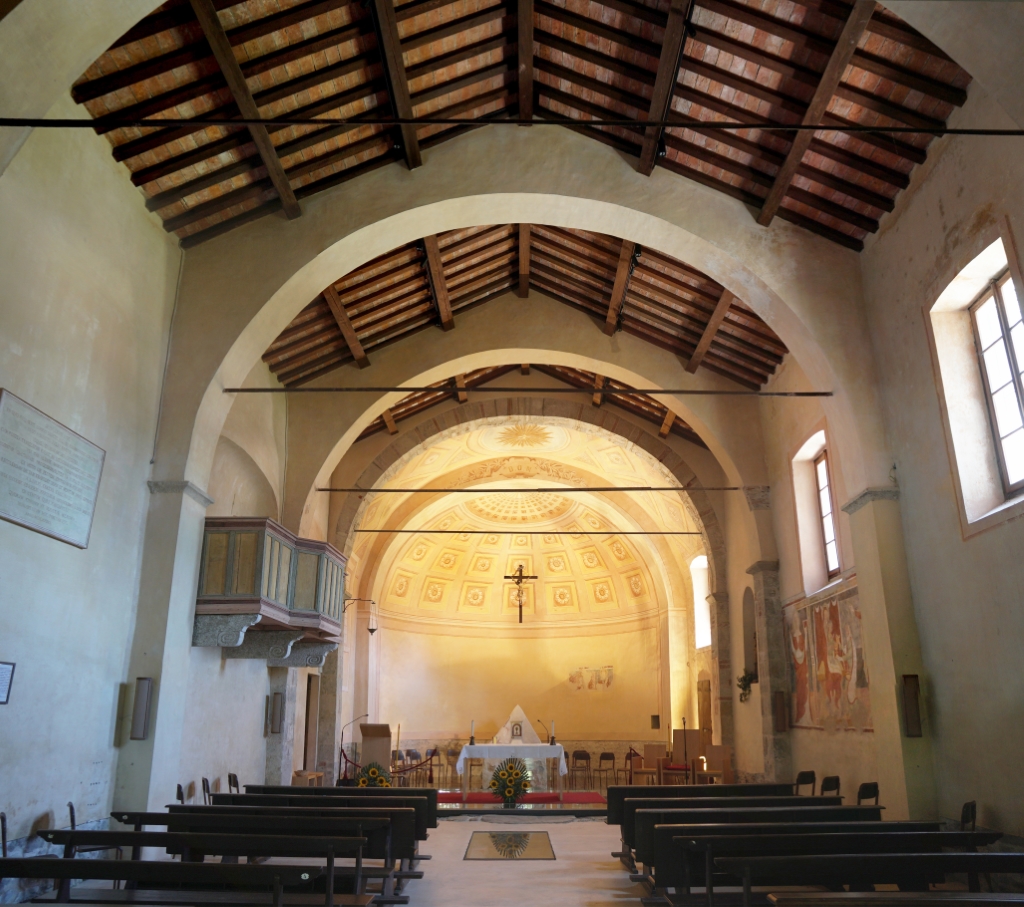 Interno: sul lato destro, affreschi del quattrocento di autore ignoto rappresentanti San Lorenzo, con la tradizionale graticola in mano, parzialmente conservati in buono stato. |