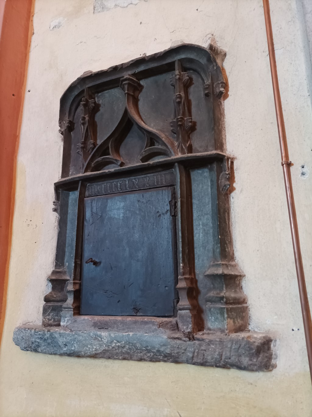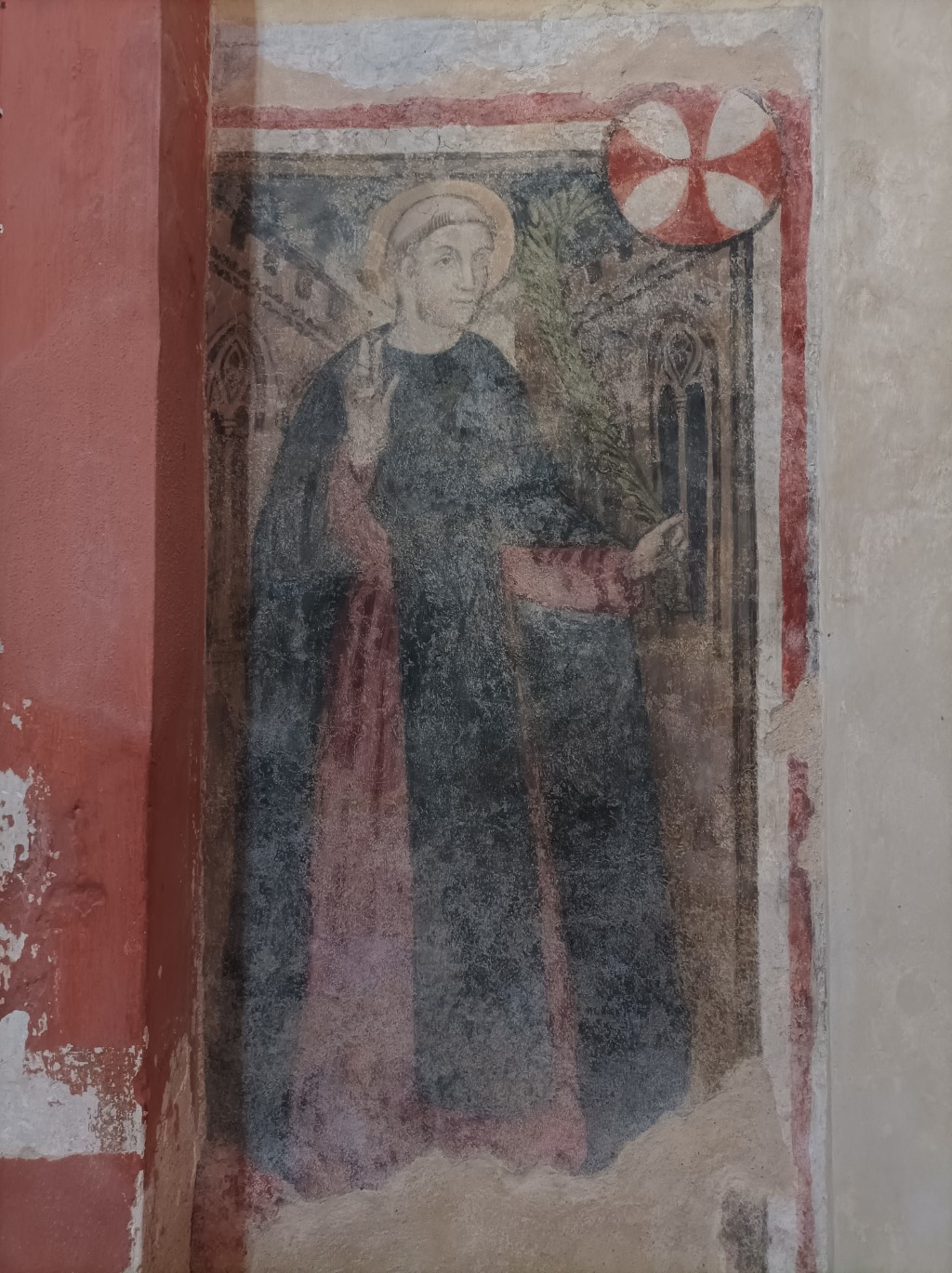 Esterno: facciata a capanna più volte rimaneggiata con affreschi del '400- '500 tra cui San Cristoforo, una Deposizione dalla Croce, Madonna col Bambino tra i Santi Filippo e Giacomo; abside poligonale. In facciata lapide romana con la seguente scritto: ENICA COMIONGIA NEVI F PRAMIONI UXSOR(I?) SE-IEN--- CV--- V |