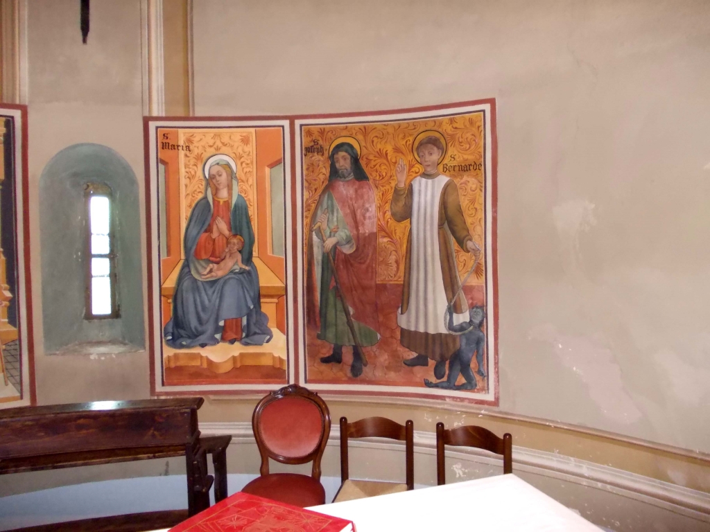 Interno: a tre navate, baroccheggiante. La navata sinistra è stata soppressa e trasformata in ingresso laterale/sacrestia; della navata destra esiste solo l'abside che fu sfondata per utilizzarla come base del campanile. Nell'abside affreschi attribuibili alla cerchia dei Biasacci e malamente restaurati da un pittore/restauratore locale. |