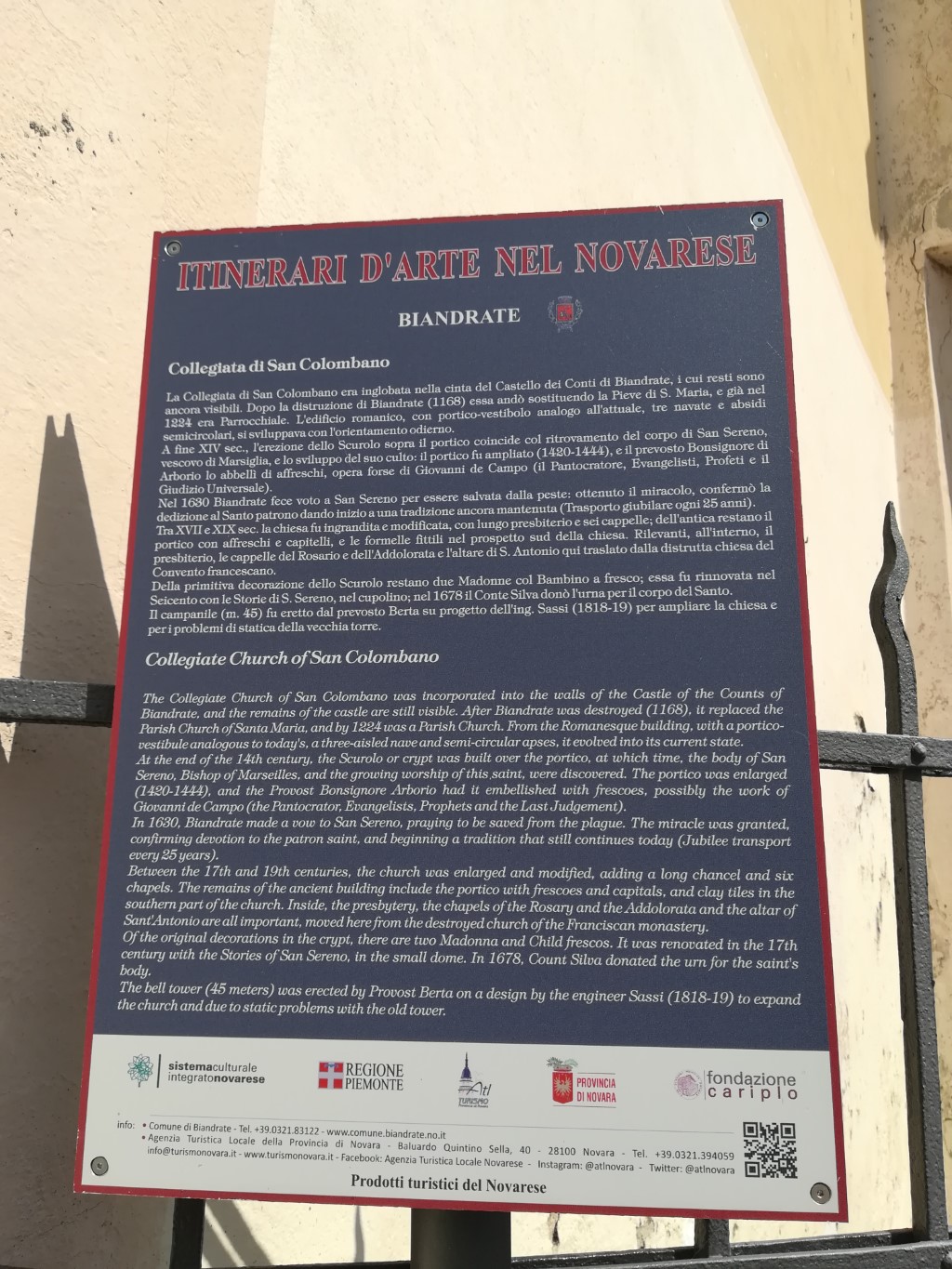 Notizie generali: ricostruita nell'800 conserva parti della originaria chiesa romanica del XII secolo, già chiesa del convento di San Colombano de Blanderate. Nel porticato è conservata l'urna di San Sereno, vescovo di Marsiglia morto nei pressi di Biandrate mentre tornava da Roma. |