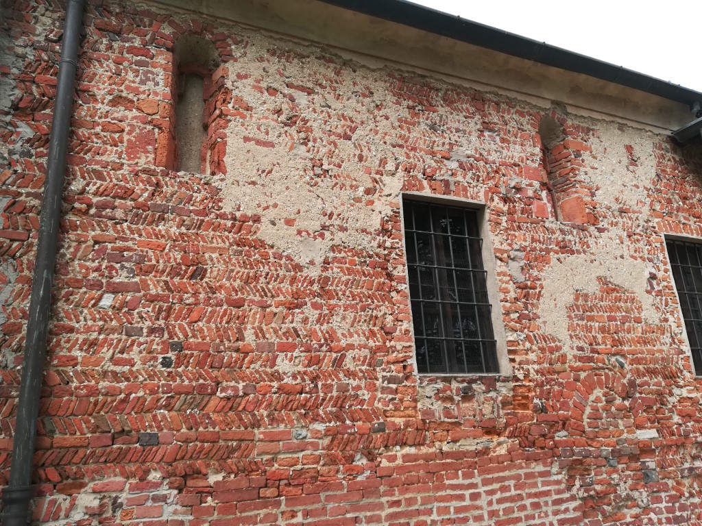 Esterno: abside romanica a tre archetti pensili tra lesene; muratura in mattoni alternati da liste a lisca di pesce di frammenti di tegole di spoglio,. |