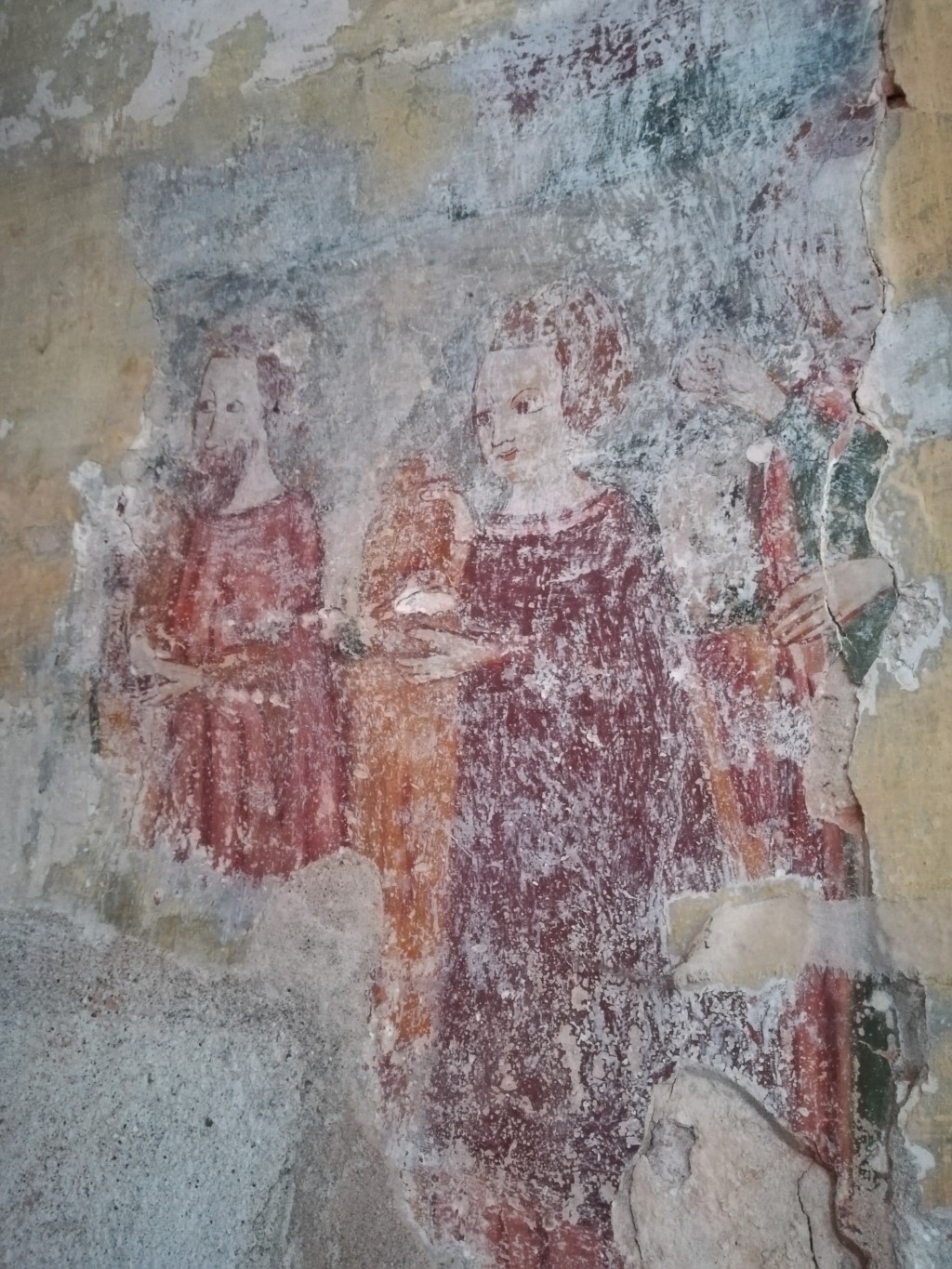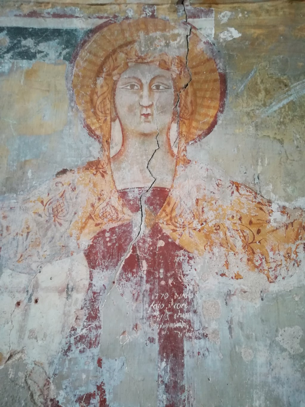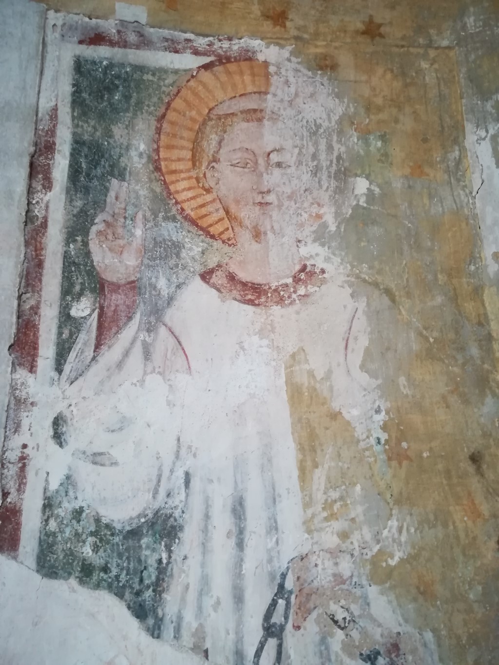 Esterno: abside romanica, semicircolare ornata di archetti pensili e arcate cieche sui fianchi. Sul fianco sud affreschi del '400 quasi invisibili. |