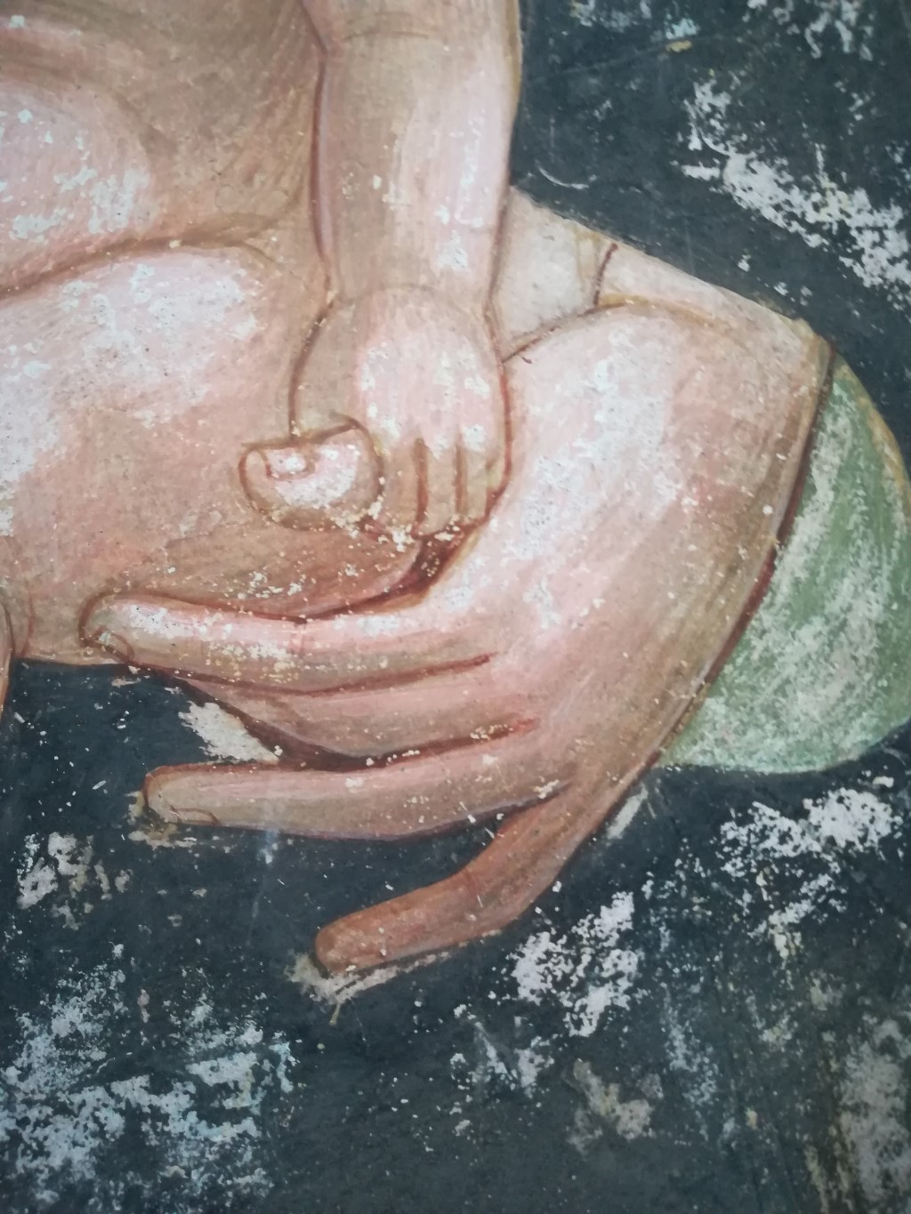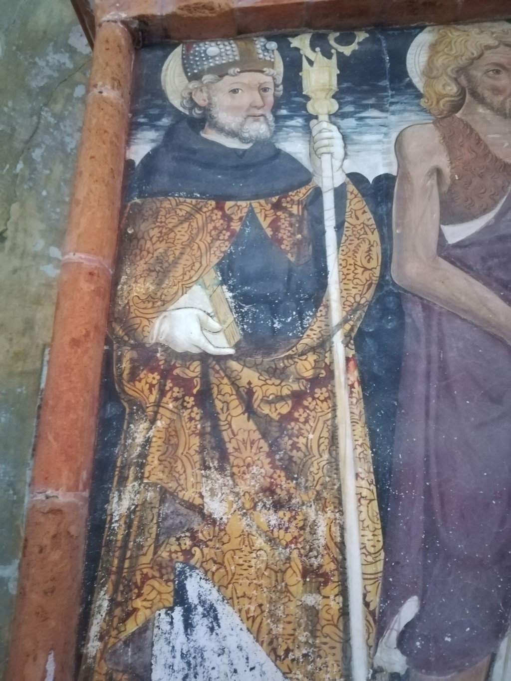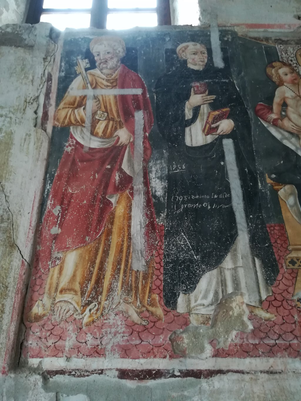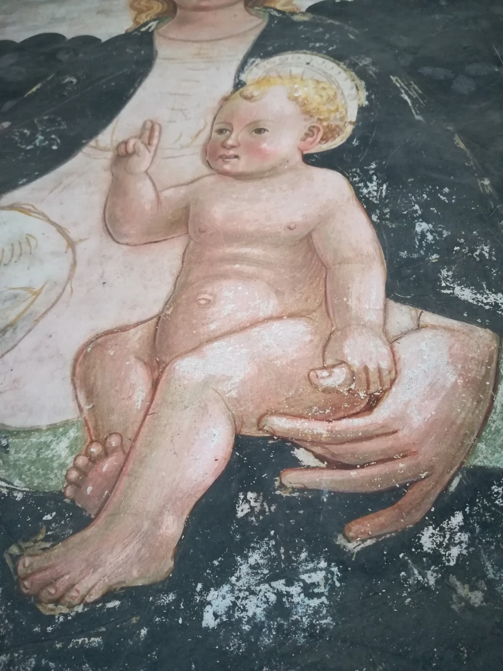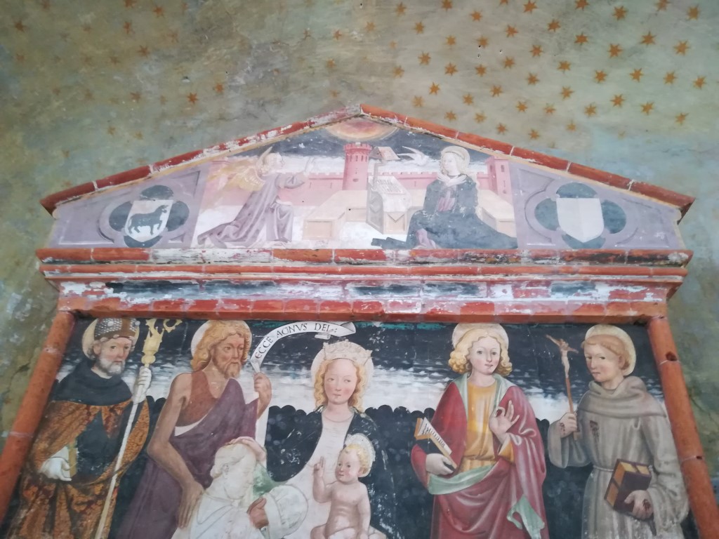 Interno: nella zona absidale Madonna del Latte e Adorazione dei Magi; all'altare ancona del '400; affreschi di varie epoche e un dipinto della Vergine col bambino tra Santi. Gli affreschi che decorano le pareti presentano interessanti graffiti eseguiti dai fedeli nel corso dei secoli riportanti notizie sugli avvenimenti della comunità. |