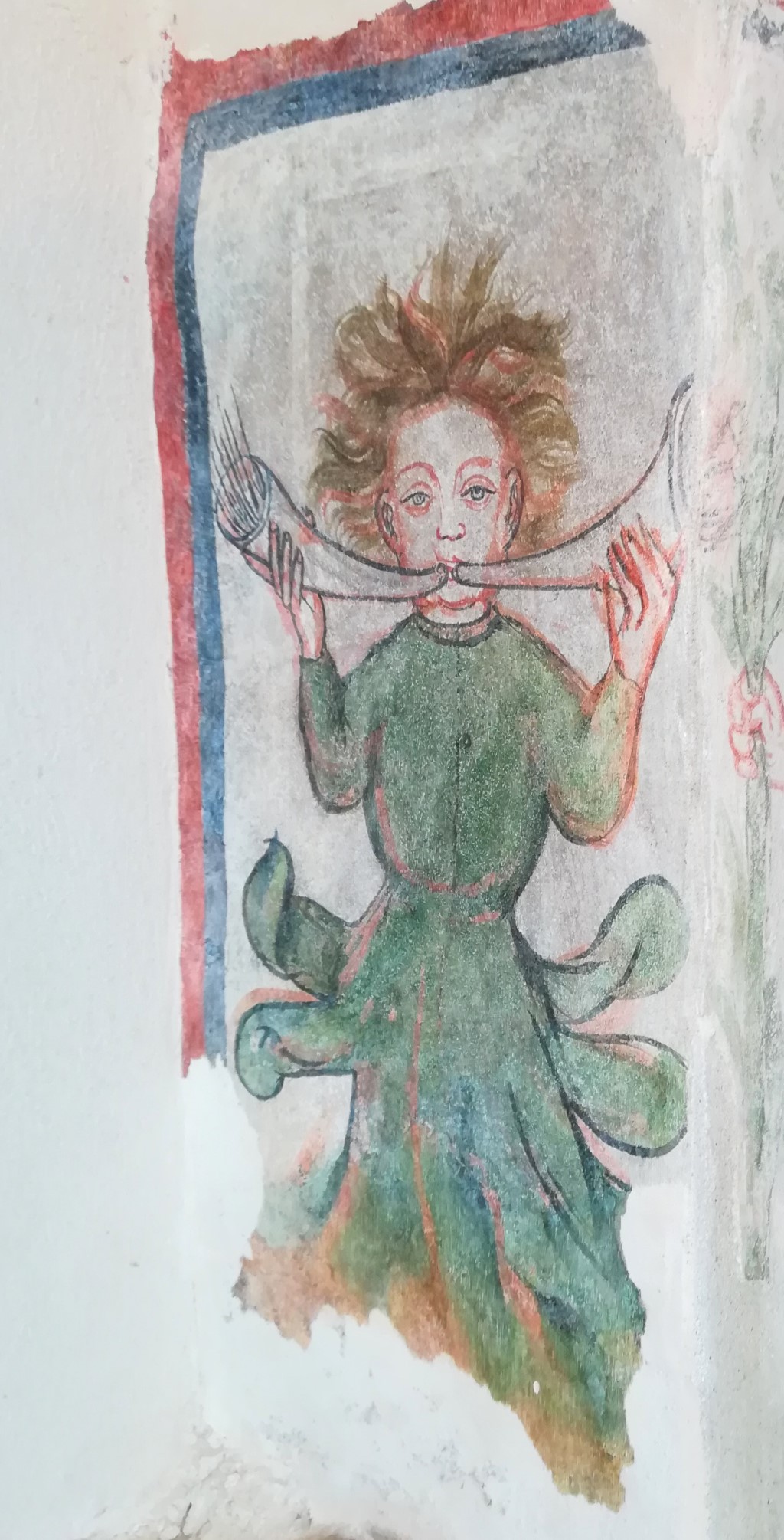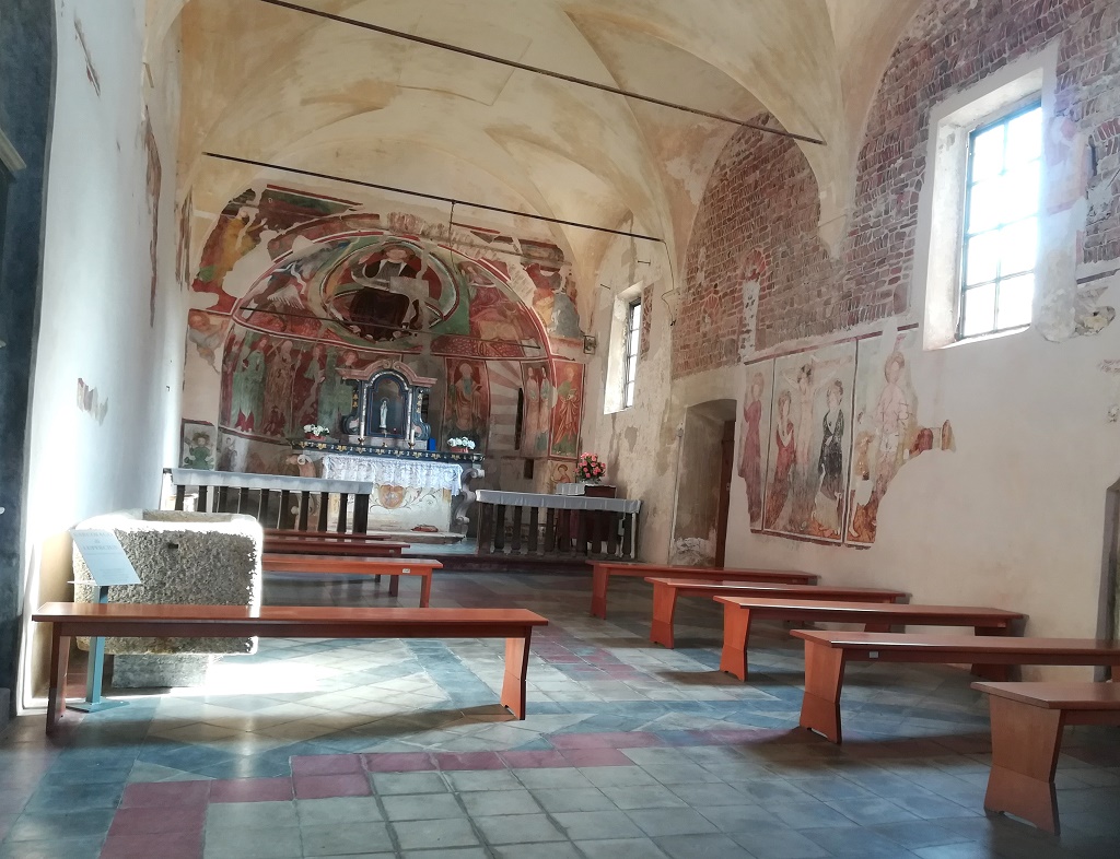 Interno: affreschi del tardo '400 raffiguranti Cristo Giudice attorniato dagli apostoli, simboli degli Evangelisti e allegorie dei lavori dei mesi nell'abside. Nella tazza dell'abside è raffigurato il Cristo Pantocratore, che con la mano sinistra regge il libro della vita, mentre tiene spiegati l'indice ed il medio della mano destra. Il Cristo è assiso nel nimbo a mandorla che simboleggia il Paradiso, attorniato dai Simboli dei quattro Evangelisti: l'Aquila, il Leone alato, L'angelo e il Vitello alato. Una fascia composta dagli Apostoli, ritti in piedi, contraddistinti dai "Titula" oggi illeggibili e dai rispettivi simboli iconografici, riempie il centro del catino absidale. Alla serie di Apostoli mancano due figure, rimosse nel 1875 nel corso dei restauri per portare alla luce le due monofore originali della struttura romanica. Nella zona inferiore del catino absidale, delimitata da due fasce di colore rosso e nero, si trova un secondo ciclo di affreschi. Sono dieci pannelli, divisi uno dall'altro da un alberello, che illustrano i costumi, le attività, il modo di vivere nel XV secolo. Rappresentano il ciclo dei mesi, strettamente connesso allo svolgersi dell'anno solare e legato al lavoro dei contadini. I mesi vanno da aprile a gennaio. - Aprile: rappresentato da un giovane biondo, con una tunica rosso arancio, che stringe nelle mani due pianticelle. - Maggio un nobile, vestito con una lunga tunica verde, in groppa ad un cavallo arabo, va a caccia con il falco - Giugno: un giovane contadino con una corta tunica bianca, in mezzo ad un campo, sta mietendo il grano - Luglio: un giovane contadino, vestito con la stessa corta tunica bianca, sull'aia, sta trebbiando il grano - Agosto: un bottaio, con una corta tunica rossa, sta fissando i cerchi di ferro di una botte - Settembre: un contadino, vestito con una corta tunica chiara allacciata da bottoni, con le gambe nude, pigia l'uva nel grande tino, appoggiandosi con la mano destra al bordo - Ottobre: un giovane con una corta veste di colore verde, con una lunga pertica butta giù le castagne dall'albero. Sono visibili i ricci marroni fra le foglie verdi - Novembre: un uomo, con una corta tunica rossa protetta da un grembiule bianco legato attorno alla vita, sta squartando un maiale morto appeso a dei pioli per le gambe posteriori - Dicembre: un macellaio, con tunica bianca su calze rosse, tiene una mazza di legno sollevata sopra la testa, nell'atto di abbatterla sul capo di un vitello, legato con una corda attorno al collo in modo che non possa abbassare la testa - Gennaio: una donna è seduta in una poltrona rotonda. La donna ha le mani protese verso la fiamma del focolare nell'atto di volerle scaldare. Alla catena del camino è appesa una pentola di bronzo con tre piedini. |