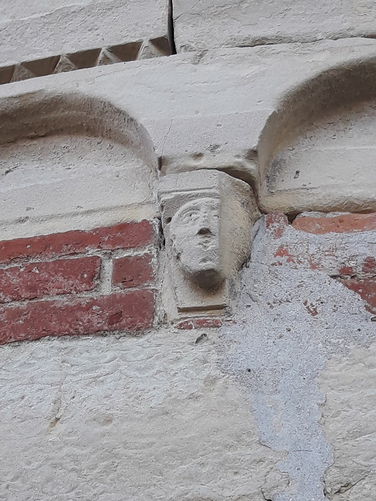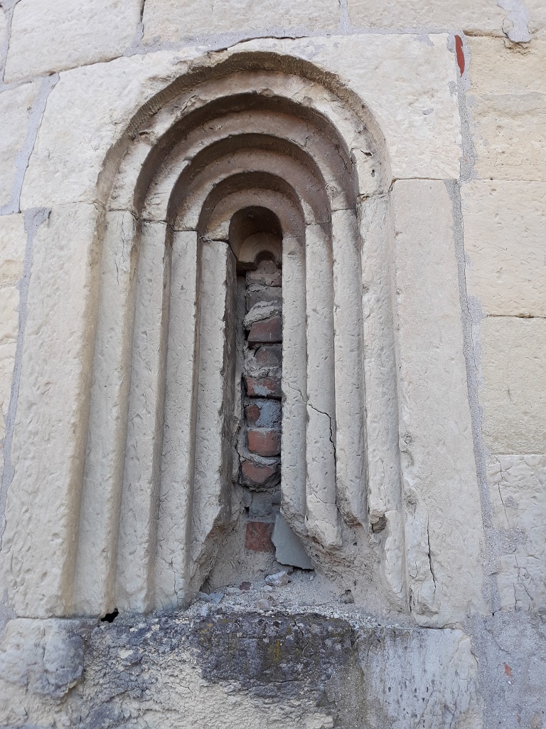 Esterno: abside semicircolare in pietra con resti di fregio a damier e dente di sega. Bel peduccio antropomorfo. Monofore dalla profonda strombatura "a gradini". |