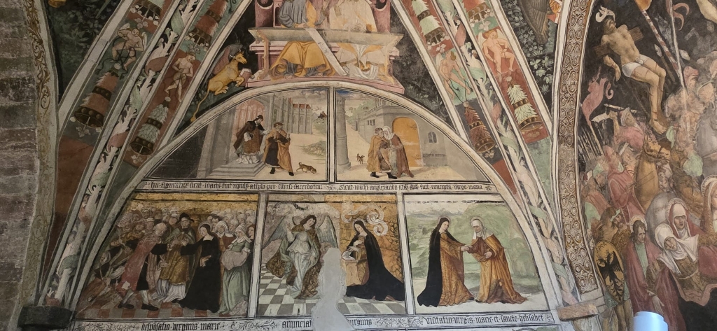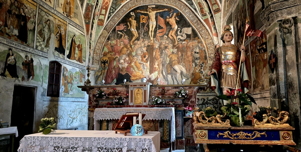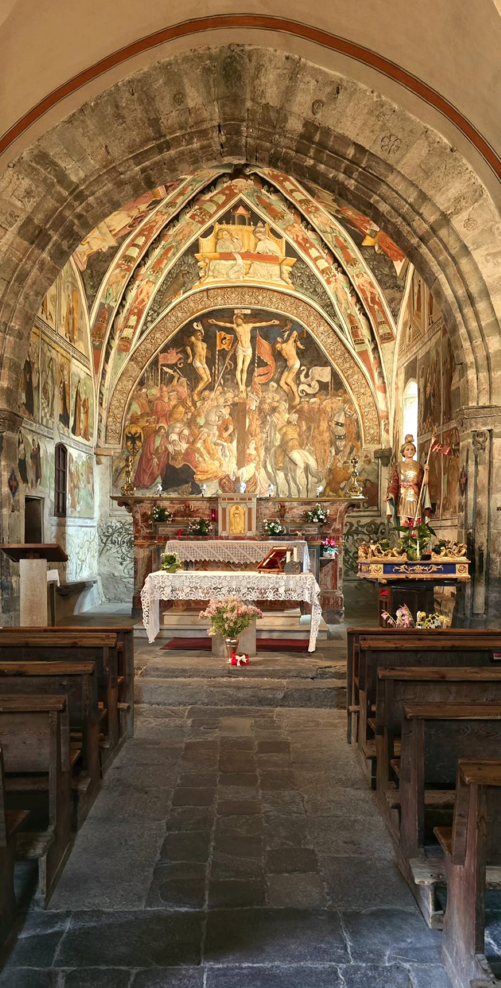 Interno: battistero scolpito del '400. Arco trionfale in pietra con sculture illustranti scene d'oltretomba e di vita medioevale tra cui si evidenziano il San Giorgio con il drago, la Sirena, l'edicola con la Madonna e il Bambino, la scena dei diavoli che bollono i dannati in un grosso paiolo con la catena, il telamone.. Nel presbiterio e nell'abside affreschi di Hans Clemer (sec- XV-XVI) rappresentanti scene della vita di Gesù con soggetti tratti anche dai vangeli apocrifi: 14 scene della vita di Maria e dell'infanzia di Cristo, mentre le rappresentazioni degli Evangelisti e dei dottori della chiesa dipinti nella vele della volta a crociera sono di anonimo di epoca precedente. La scena della crocifissione occupa tutta la parete di fondo con una folla di persone e di cavalli, lance, vessilli su cui si evidenziano i corpi crocifissi; si evidenziano inoltre le scene della partita a dadi e il gruppo delle pie donne. |