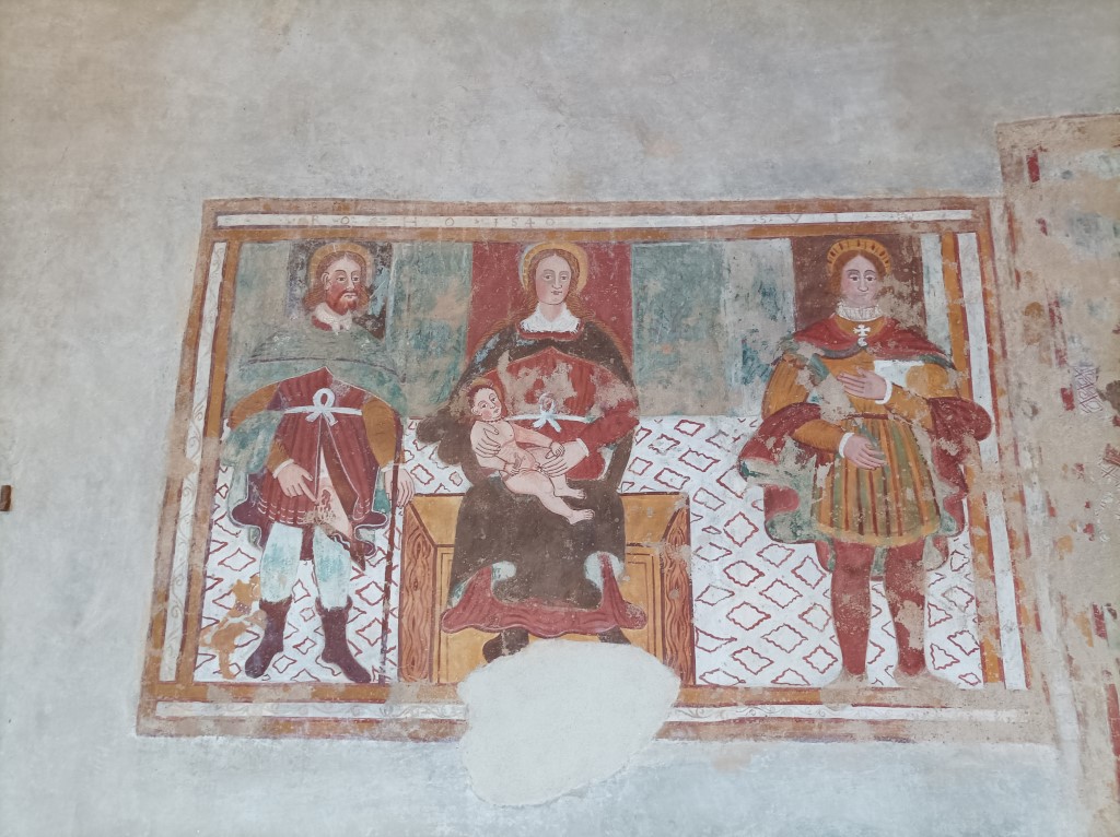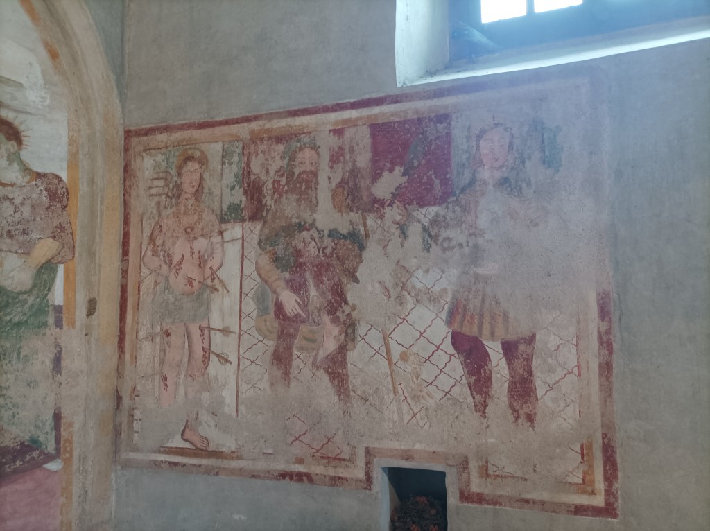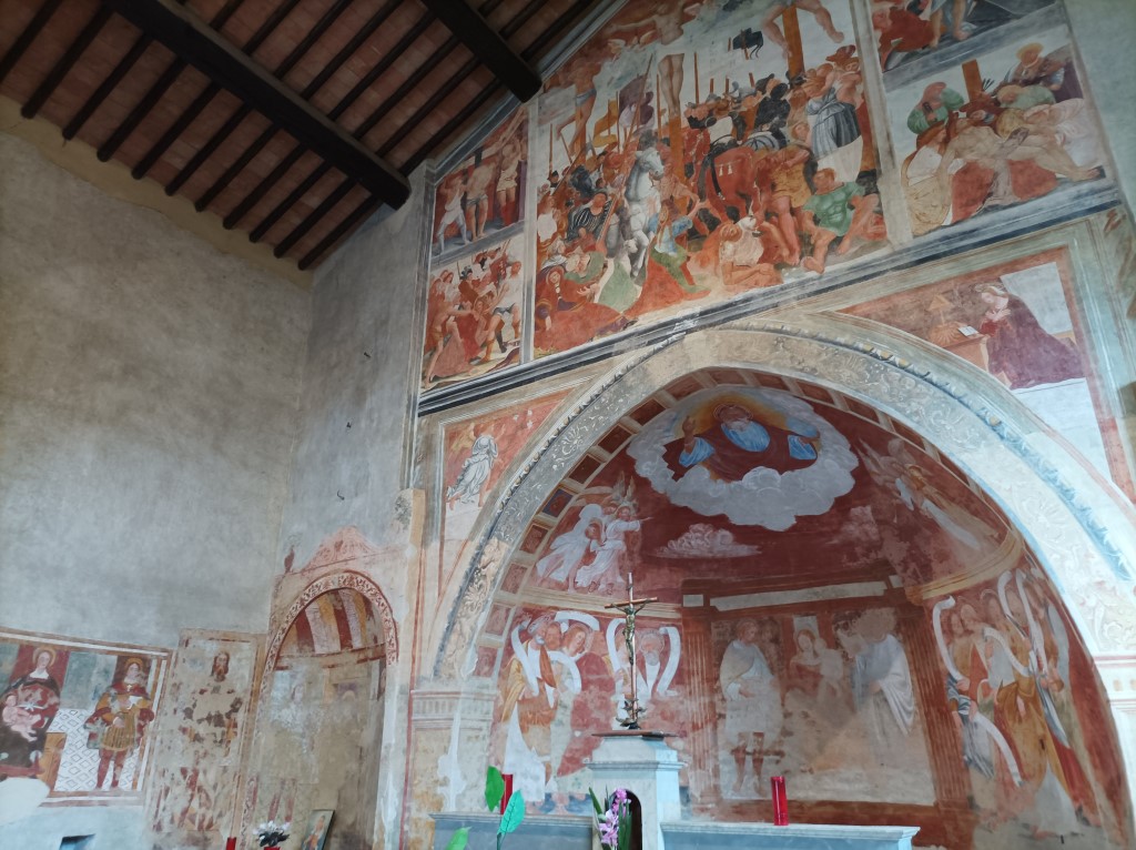 Interno: conserva nella unica, ampia navata affreschi cinquecenteschi di scuola Gaudenziana; in particolare nell'abside e nella parete orientale la Crocifissione di Gesù Cristo riferibile alla analoga parete affrescata nella chiesa di Santa Maria delle Grazie a Varallo Sesia; i dipinti a lato della Crocifissione sembrano coevi e attribuibili a Giovanni Maria de Rumo, pittore oleggese attivo nella metà del XVI secolo che ha lasciato numerose opere in varie chiese del novarese. |