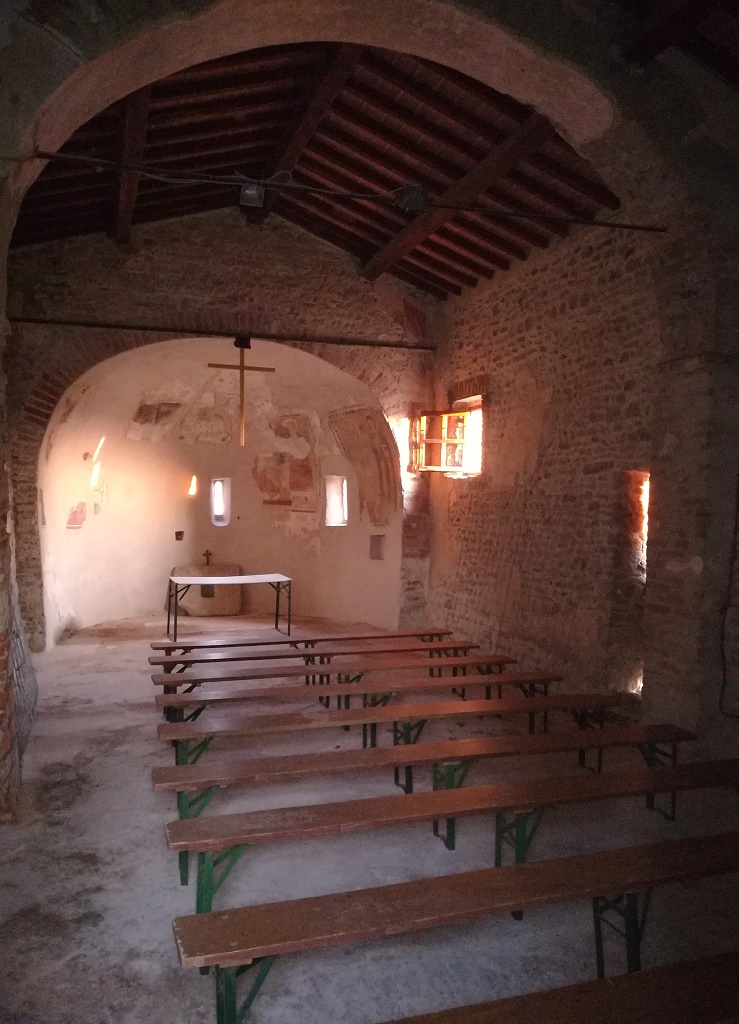 Interno: a una navata, con abside semicircolare coperta da volta a semicatino; sia l'abside che le pareti laterali conservano tracce di pitture sbiadite. Nell'abside frammenti raffiguranti figure virili erette; una coppia di Santi è stata attribuita a Domenico della Marca d'Ancona (attivo in Piemonte nella prima metà del XV secolo), che lavorò a Bollengo nel terzo decennio del '400. |