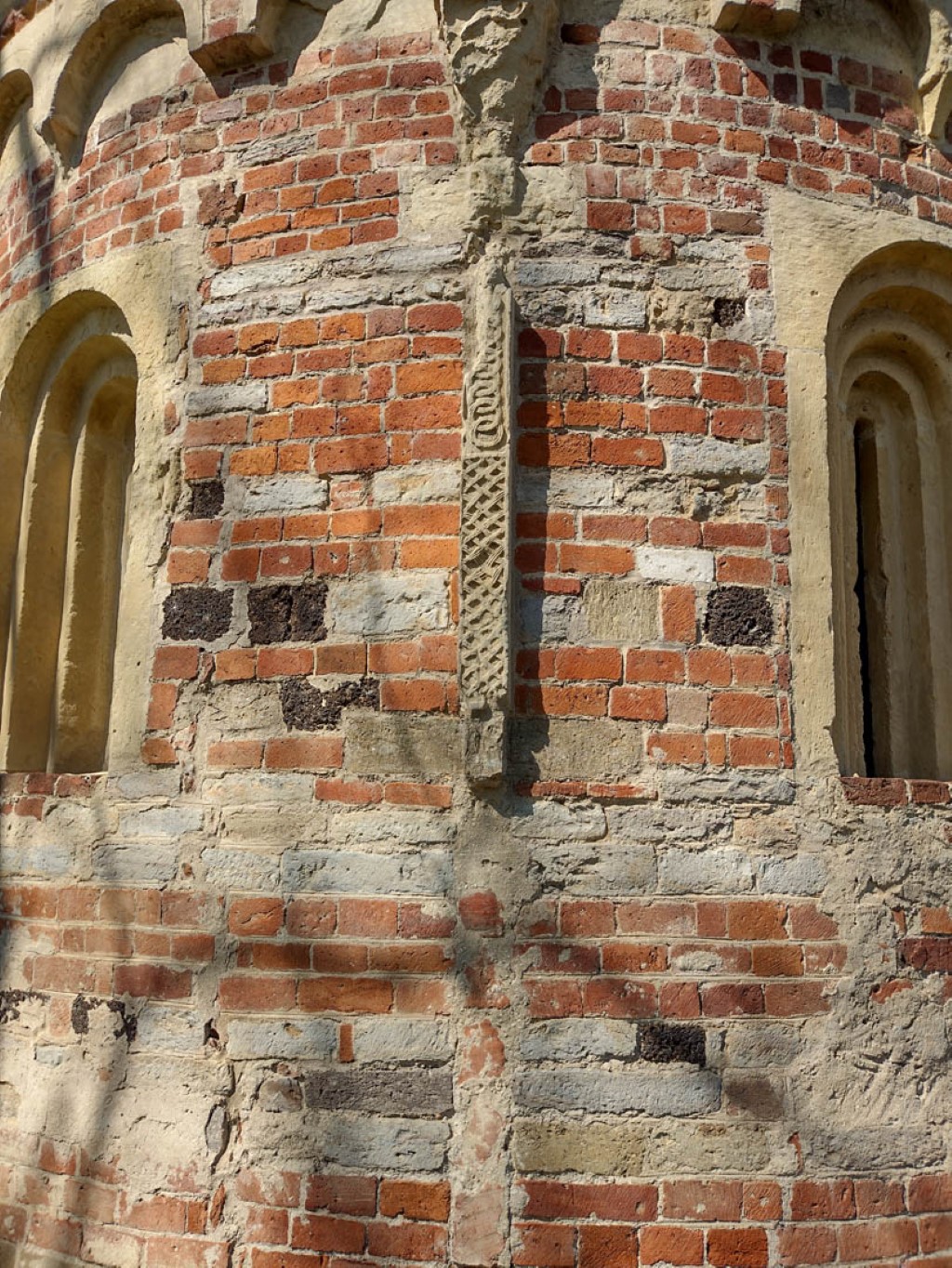Esterno: facciata a capanna con portale leggermente aggettante. Abside con archetti pensili monolitici in tufo e lesene e capitelli in pietra scolpiti. |