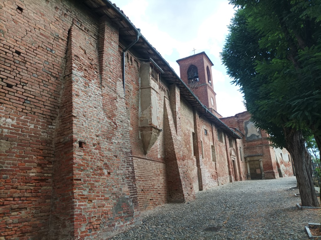 Esterno: portale gotico fortemente strombato con sopra un oculo e archetti pensili sulla facciata in cotto spartita da due contrafforti. |