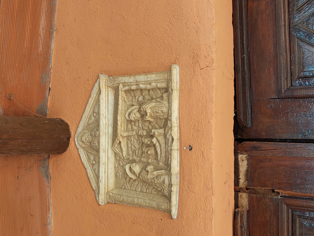 Esterno: preceduto da un piccolo atrio loggiato; sulla facciata la formella scolpita del Presepe. |