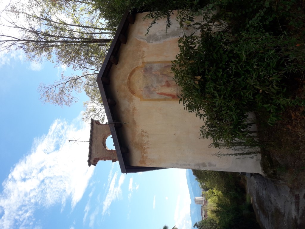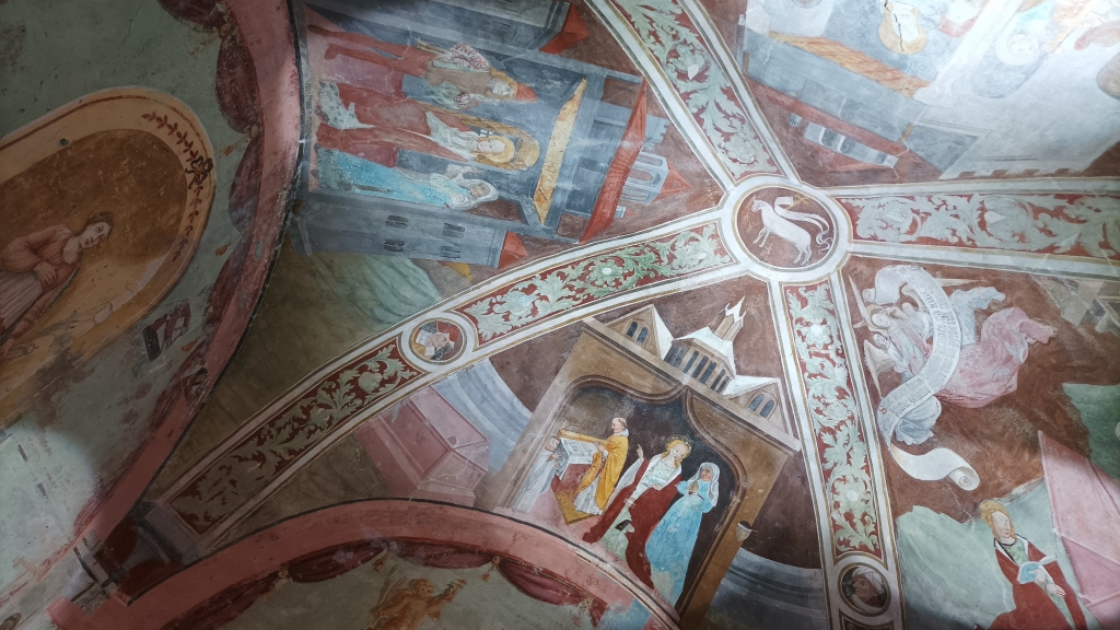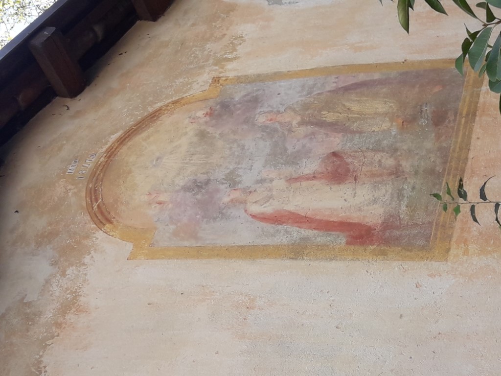 Esterno: Tracce di affresco nella parte absidale e affreschi sotto al portico |