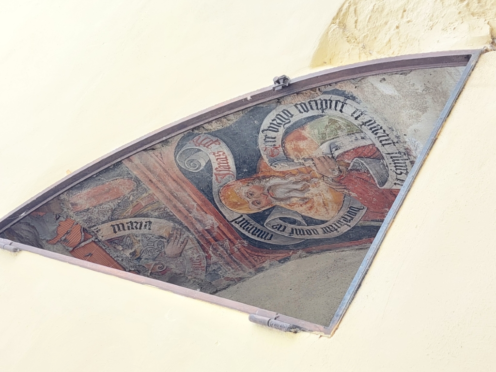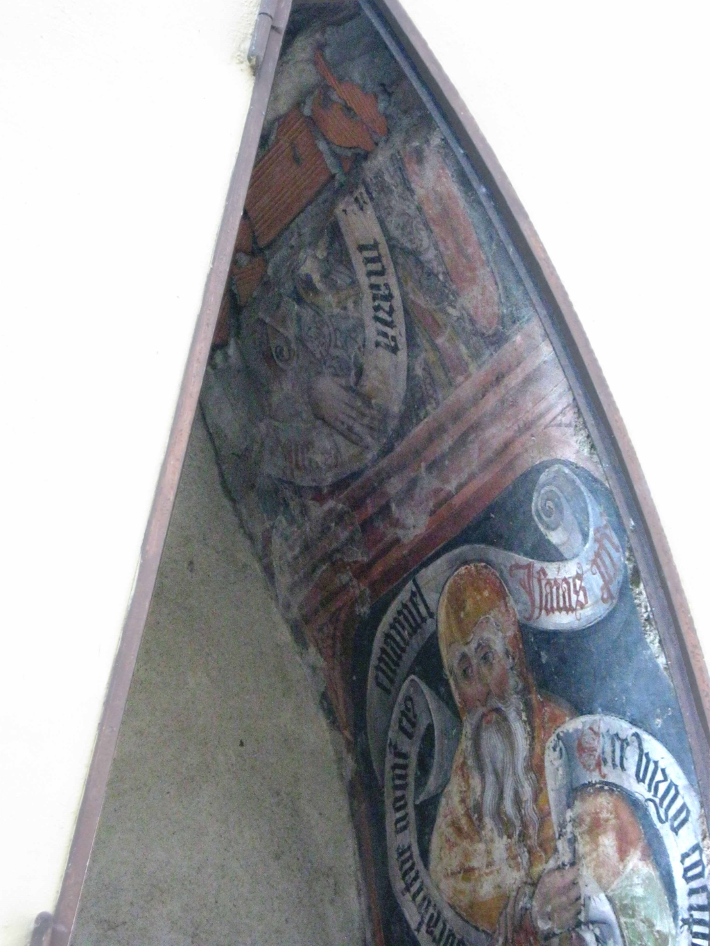 Esterno: in due nicchie create sulla parete laterale esterna della chiesa dal lato del campanile, spezzoni di affreschi databili tra la fine del '300 e l'inizio del '400, coevi a quelli di San Bernardino di Lusernetta e forse della stessa mano. Fanno probabilmente parte di un ciclo dedicato alla Natività e correvano sulla facciata interna di un arco che dava forse accesso a una cappella. Sono riconoscibili un angelo della Natività e nella nicchia verso la facciata il profeta Isaia ed un cartiglio "Ecce virgo concipiet et pariet filium et vocabitur nomen Emmanuel" |