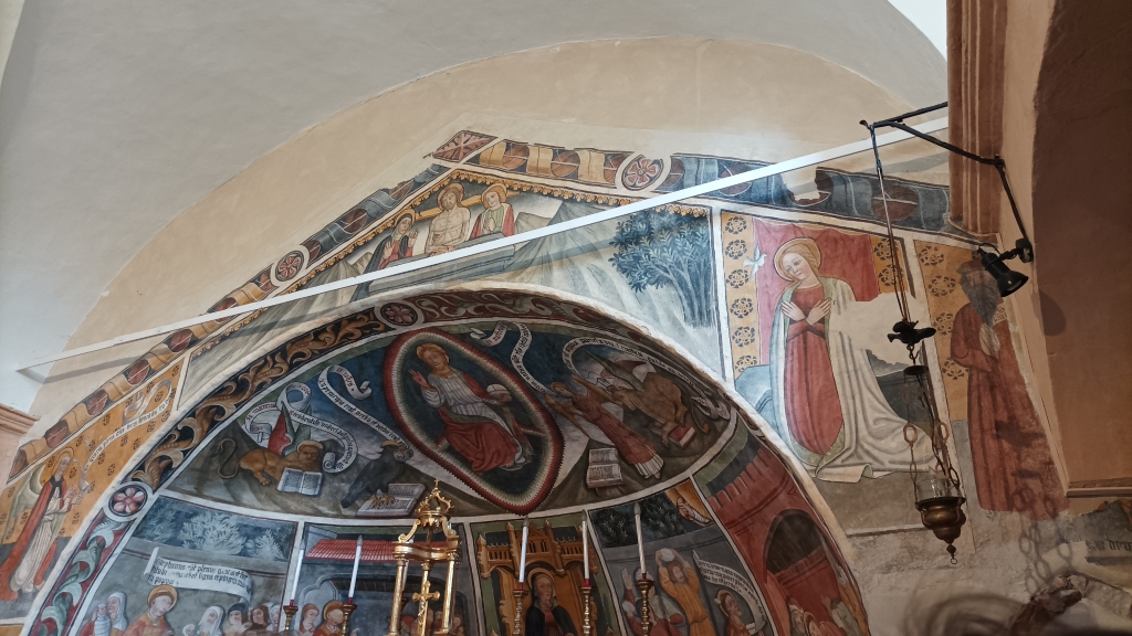 Notizie generali: Risalente al XII secolo, la cappella rappresenta un prezioso esempio di architettura romanica e custodisce al suo interno un ciclo di affreschi di straordinario valore artistico. |