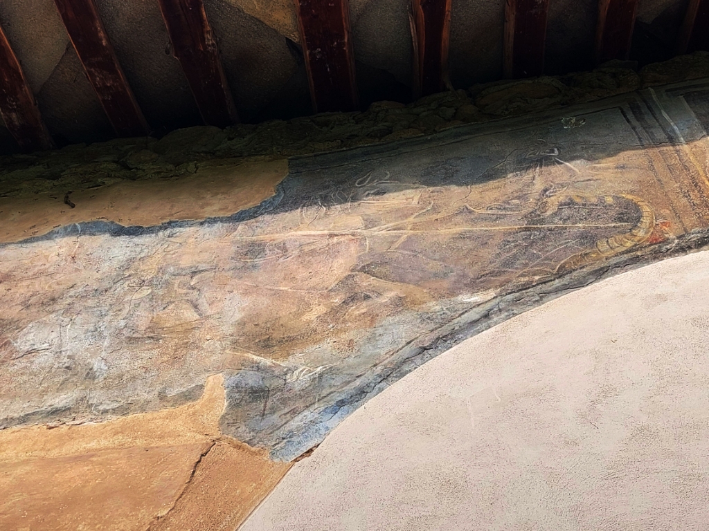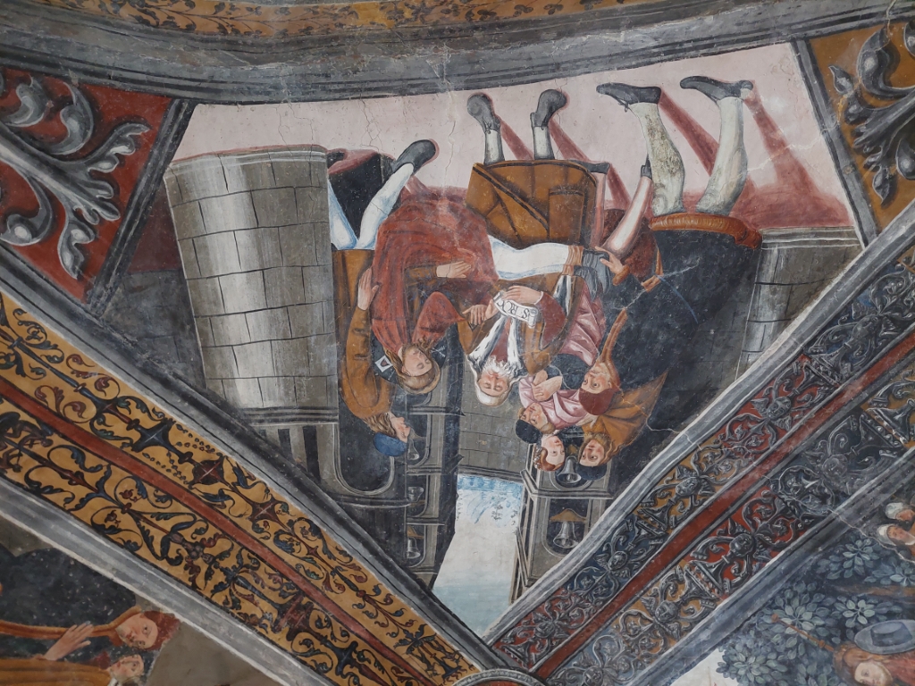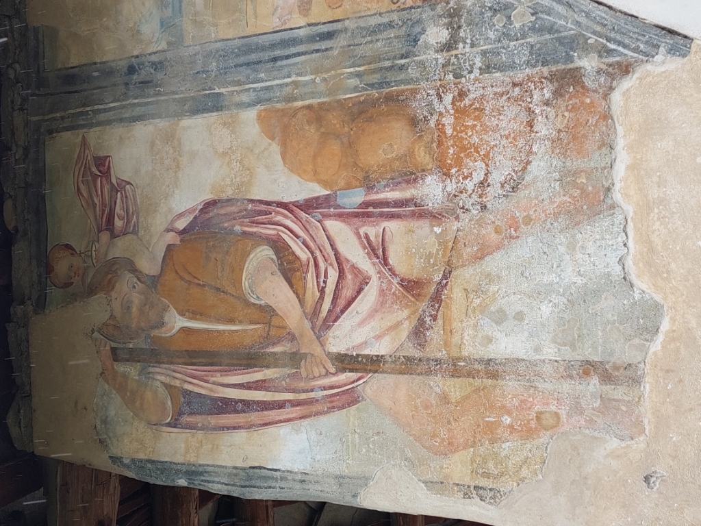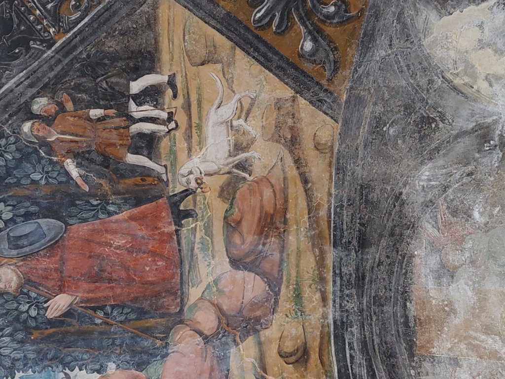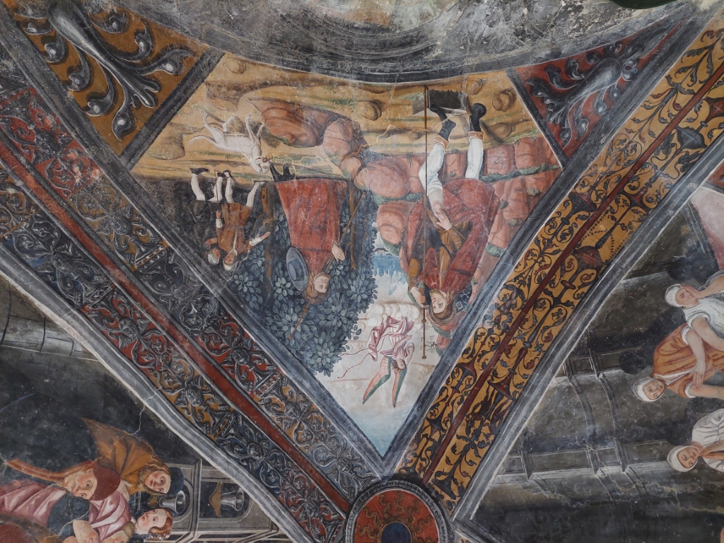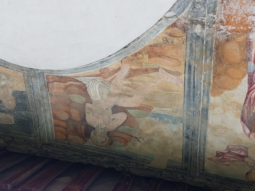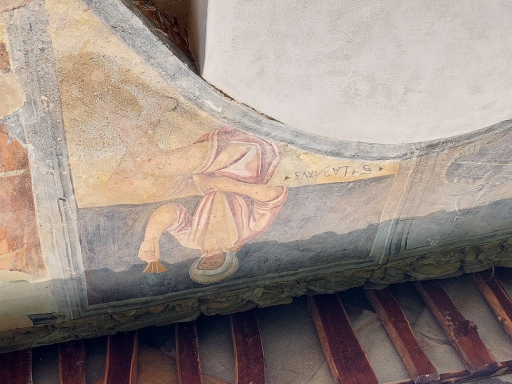 Esterno: affreschi tra cui San Giobbe, San Cristoforo, Memento Mori, San Lazzaro e San Bernardo da Mentone. |