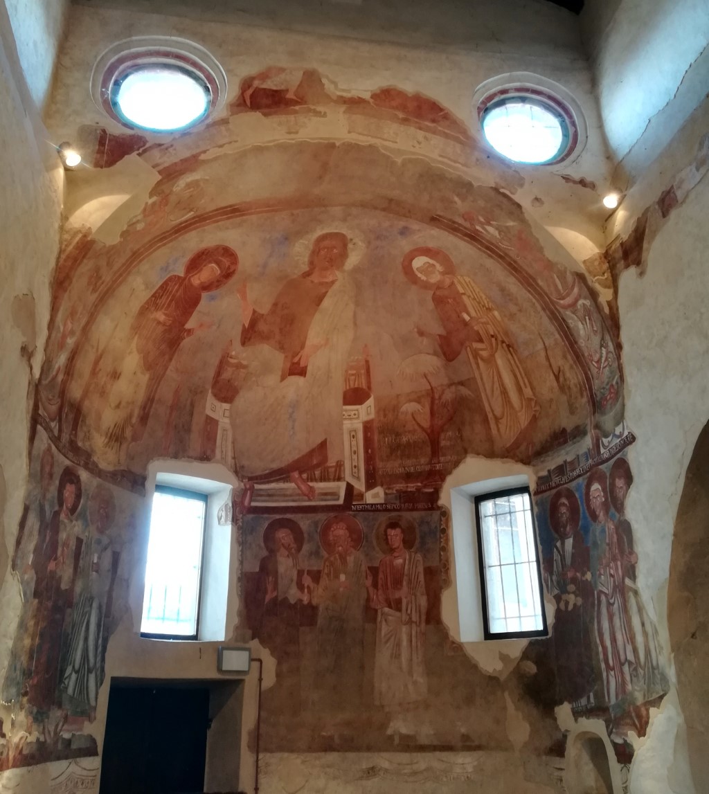 Interno: a tre navate di quattro campate ciascuna con volte a crociera terminanti in tre absidi semicircolari. Dividono le navate tre coppie di pilastri cruciformi con lesene addossate ai fianchi. Archi a pieno sesto collegano la navata centrale con quelle laterali. Le volte sono da molti considerate uno dei più antichi esempi di volta a crociera nervata in Italia presentando delle arcaicità di costruzione come l'abbassamento delle vele. Numerosi affreschi ornano l'abside e le pareti. |