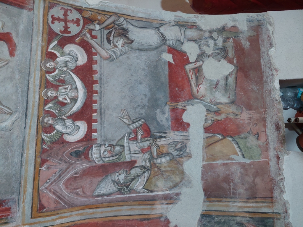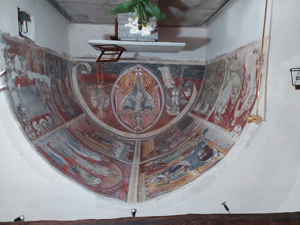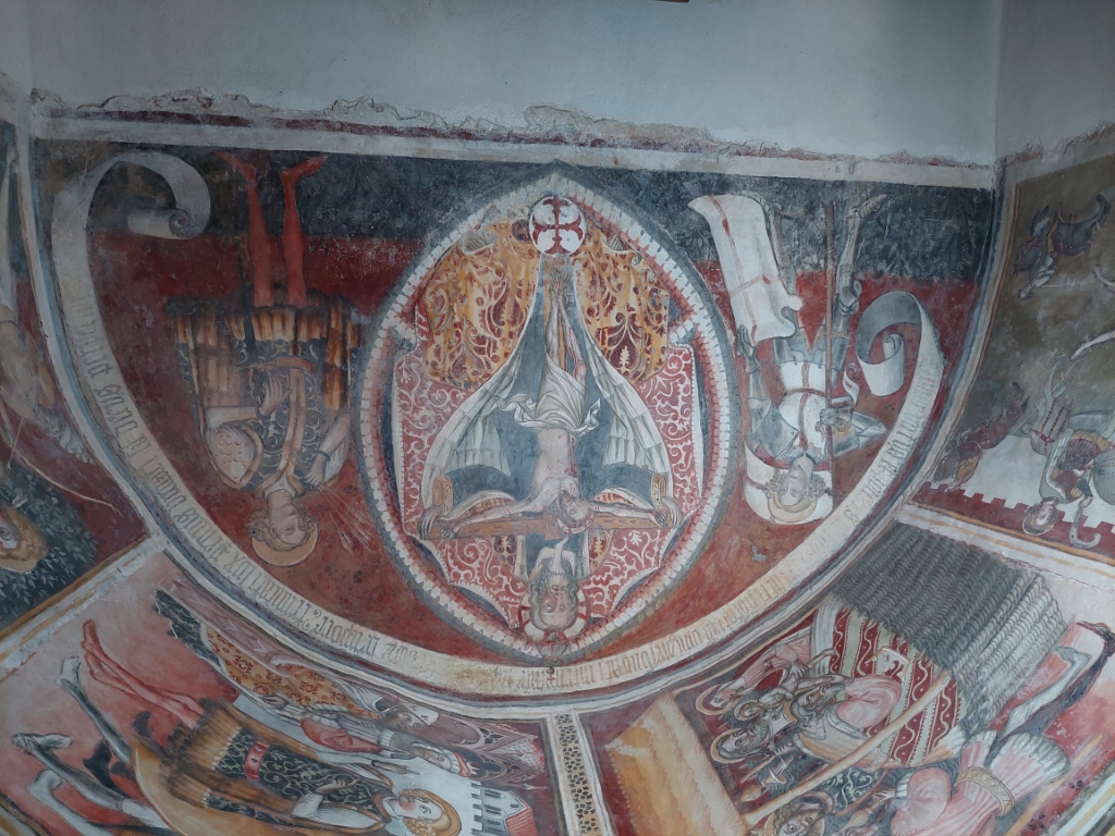 Interno: nell'abside affreschi del 1450 attribuibili alla bottega di Pietro da Saluzzo o al Maestro del Villar. |