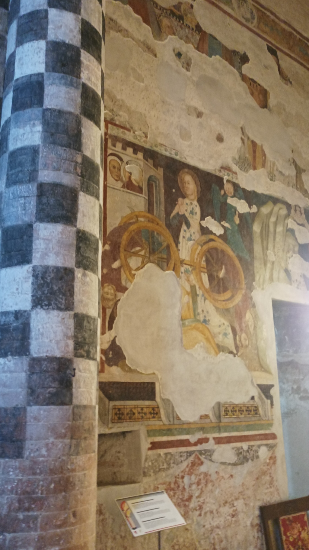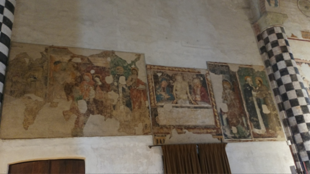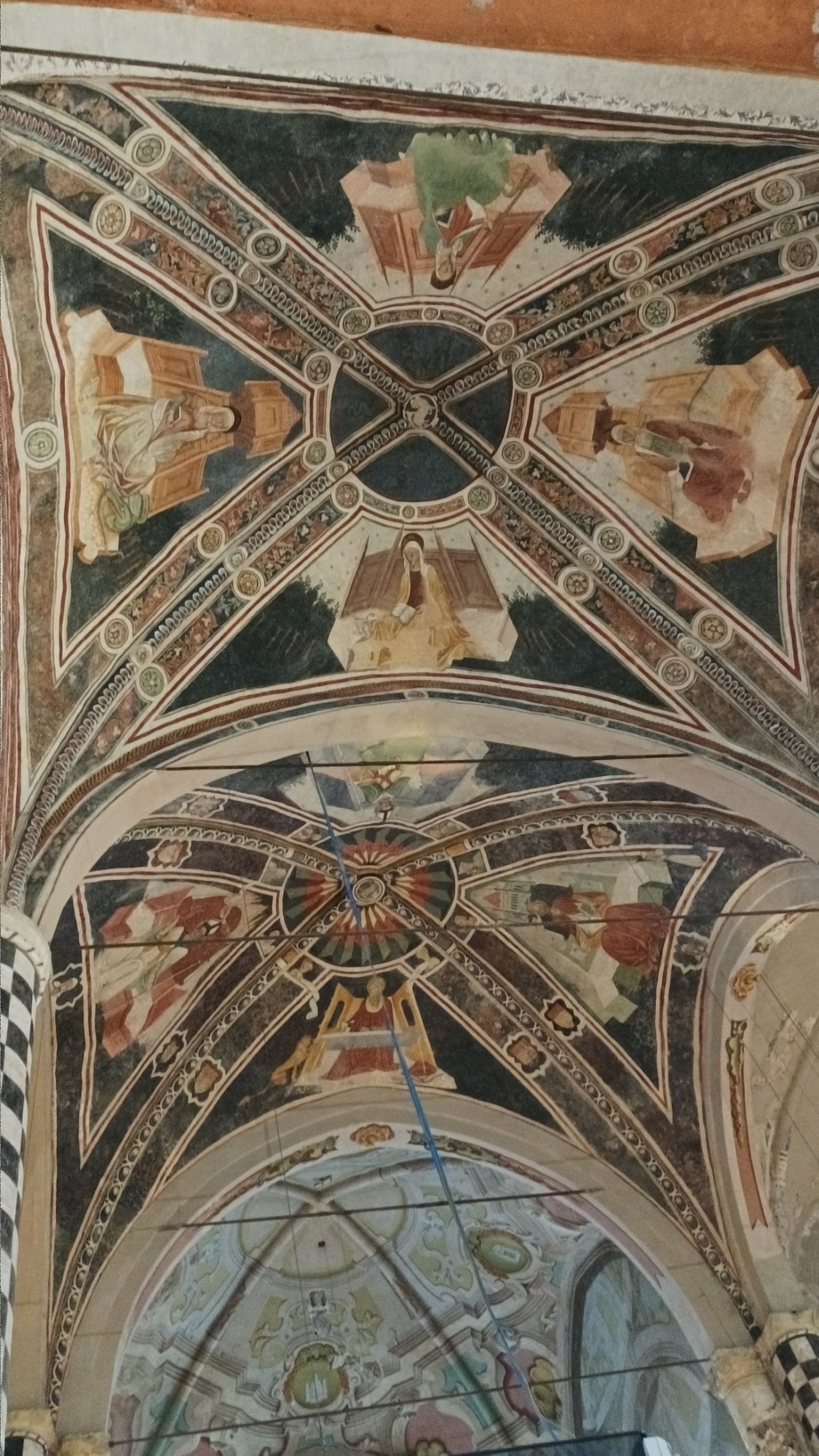 Interno: L'interno, basilicale a tre navate, presenta colonne che reggono archi ogivali e volte a crociera cordonate. Sulla parete sinistra dell'ultima campata della navata sinistra avanzi di un gruppo di affreschi di mani diverse databili XV-VI secolo e attribuiti a Giorgio Turcotto (attivo nella seconda metà del XV secolo) e a seguaci di Macrino d'Alba (circa 1494-1528). |