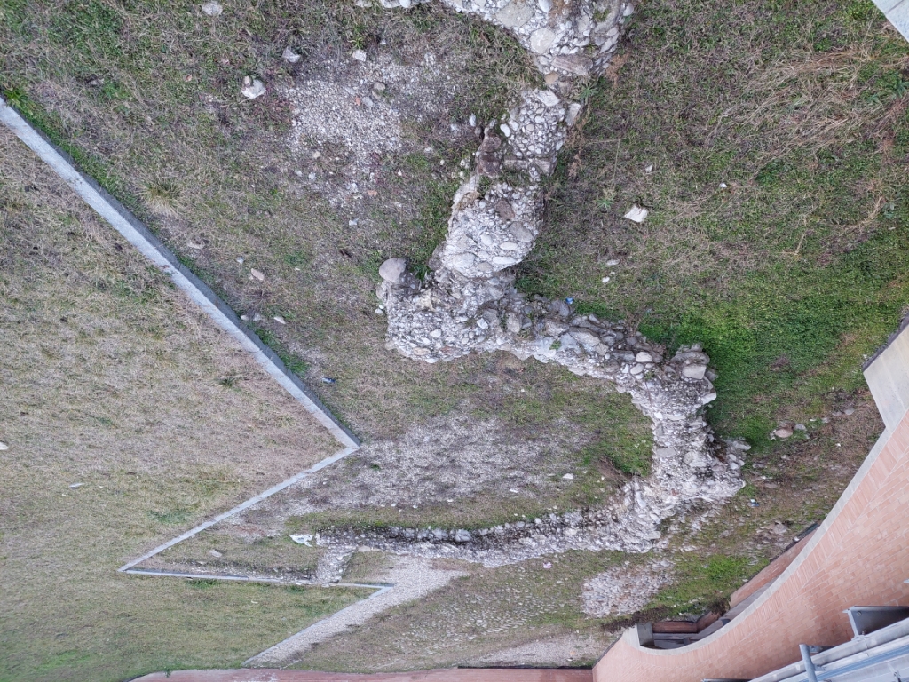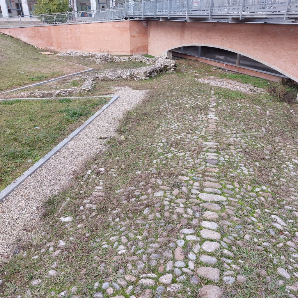 Resti della muratura dell'abside e dell'inizio della navata posti al livello della strada romana. |