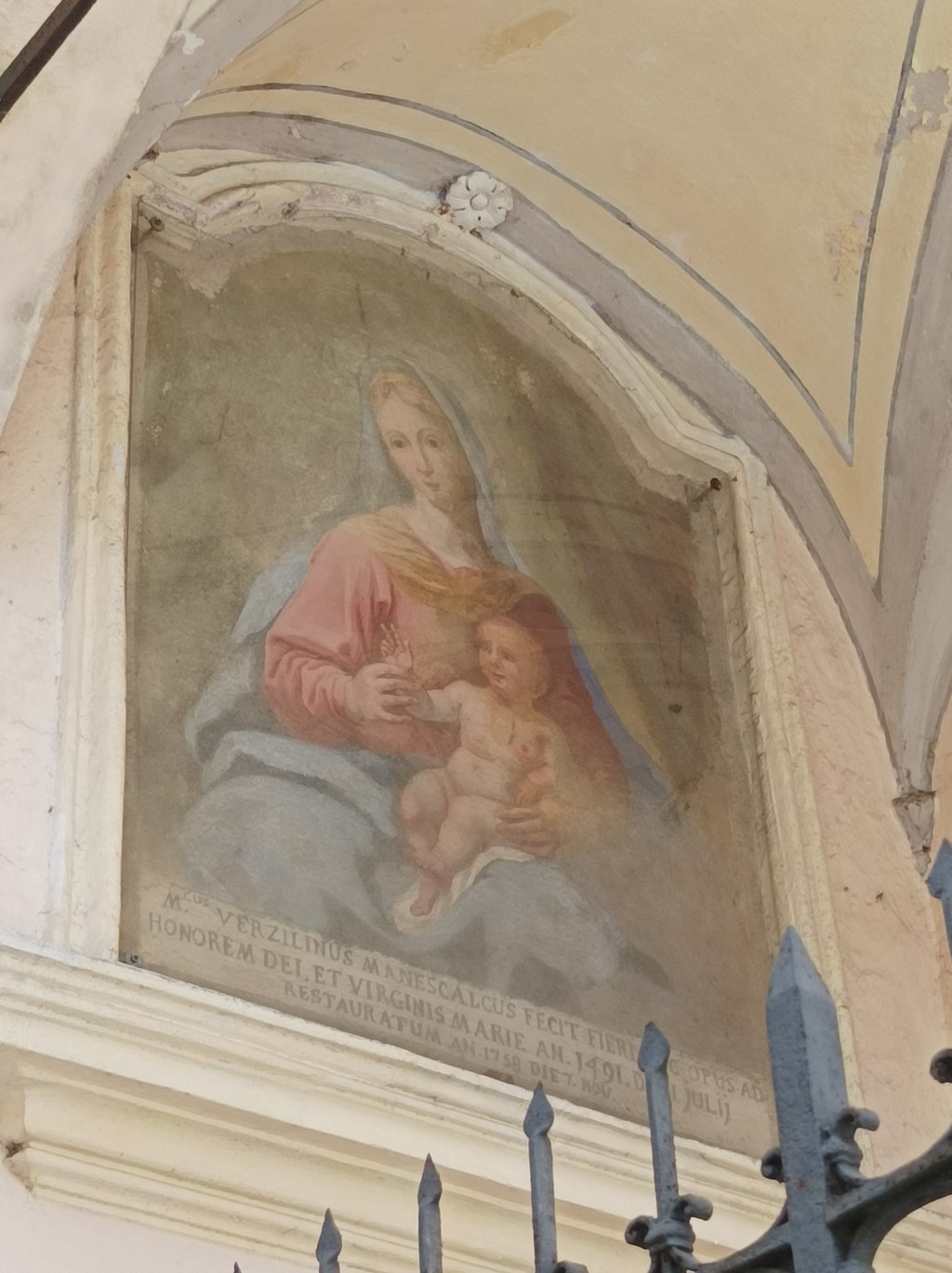 Interno: affresco datato 1491 raffigurante la Madonna col Bambino. |
