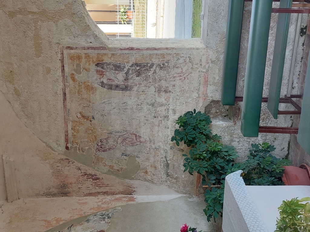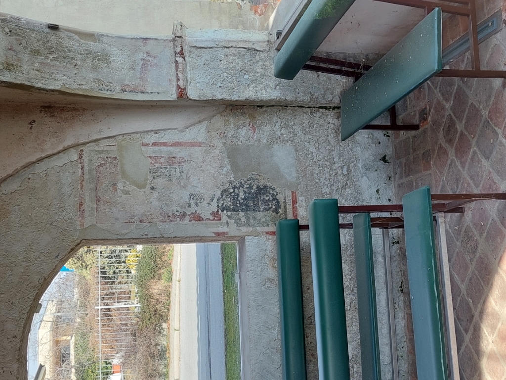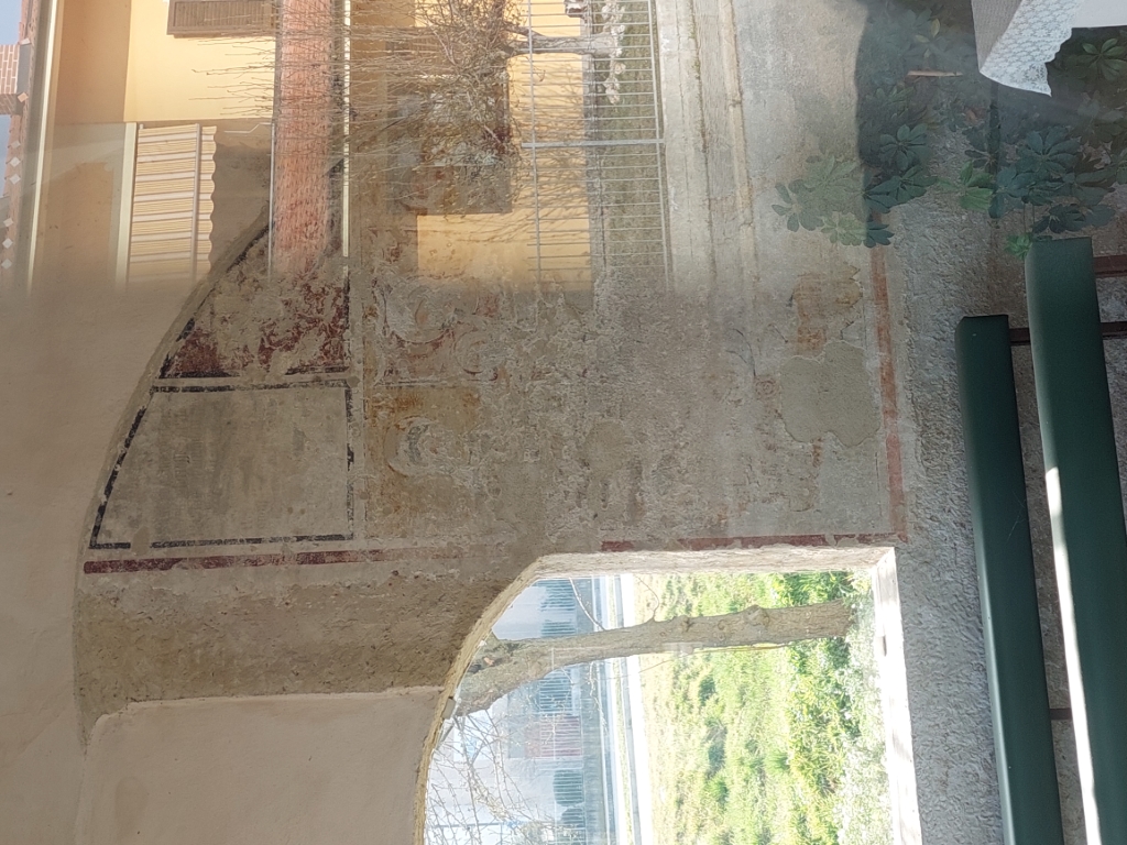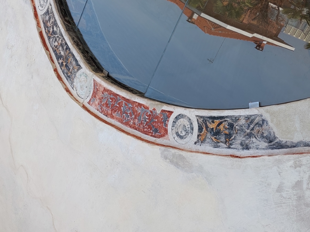 Esterno: in facciata ghiera di arcata dipinta nel '400 con motivi fitomorfi. |