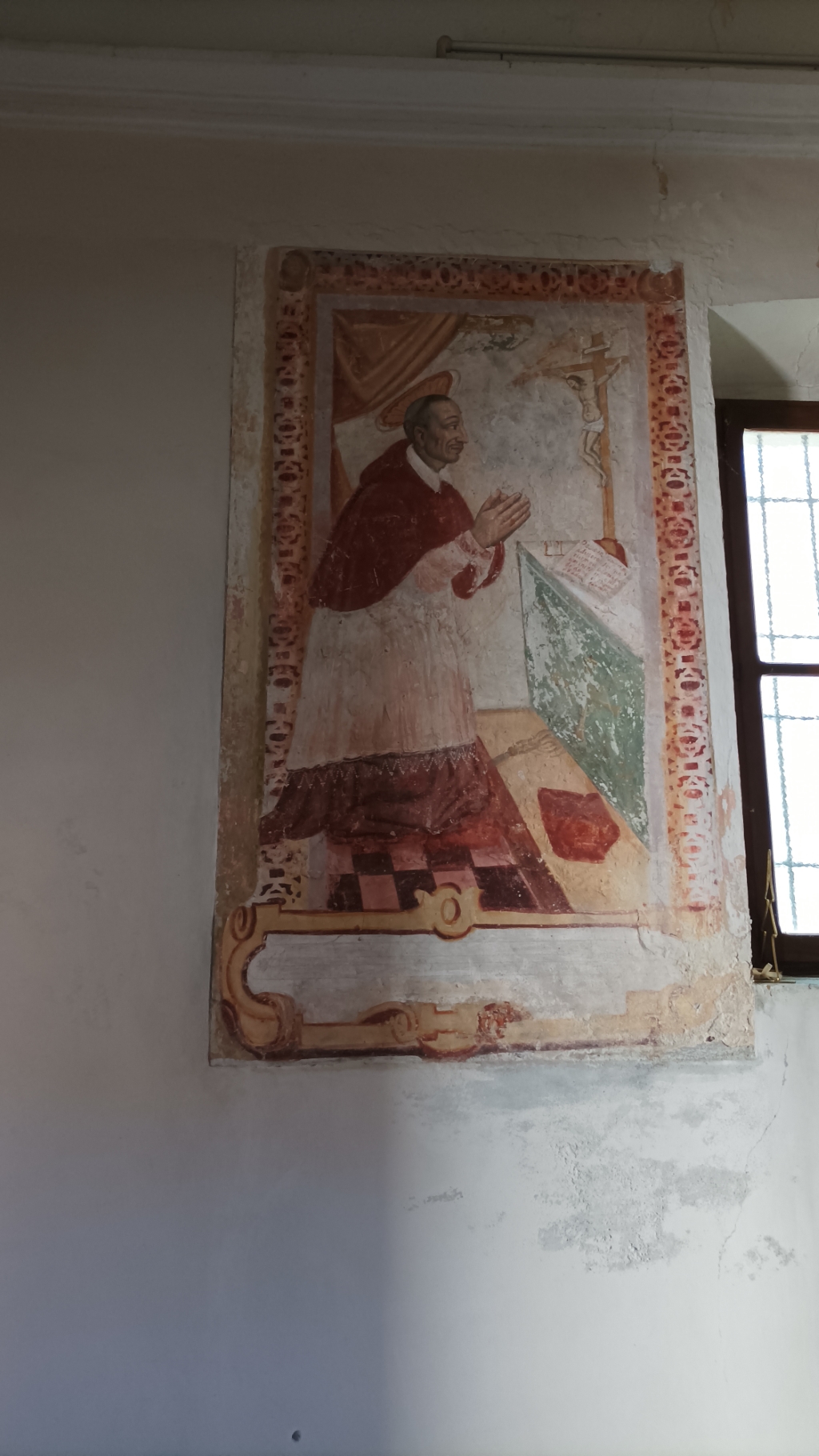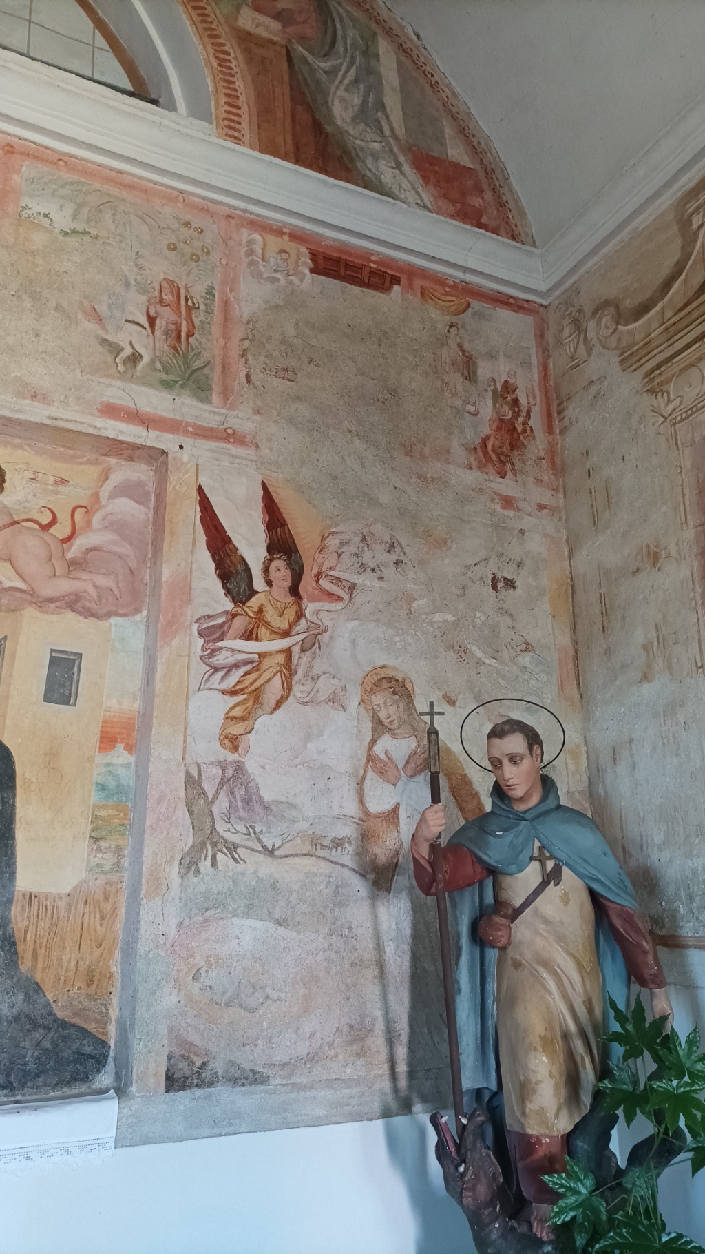 Interno: quasi completamente decorato con affreschi di diversi autori del tardo '500, pesantemente restaurati, di cui il più interessante è l'Annunciazione dell'arcata superiore con l'angelo a sinistra, la Madonna in preghiera a destra e al centro una finta finestra. |