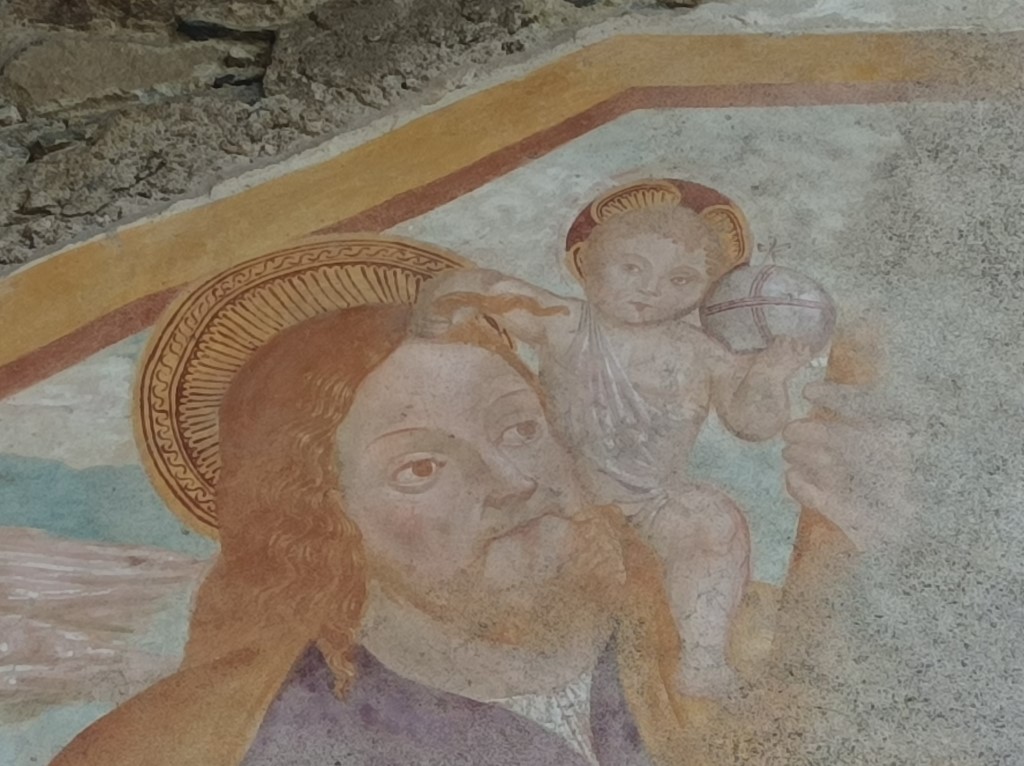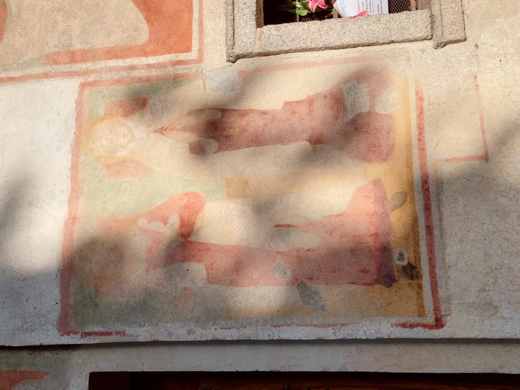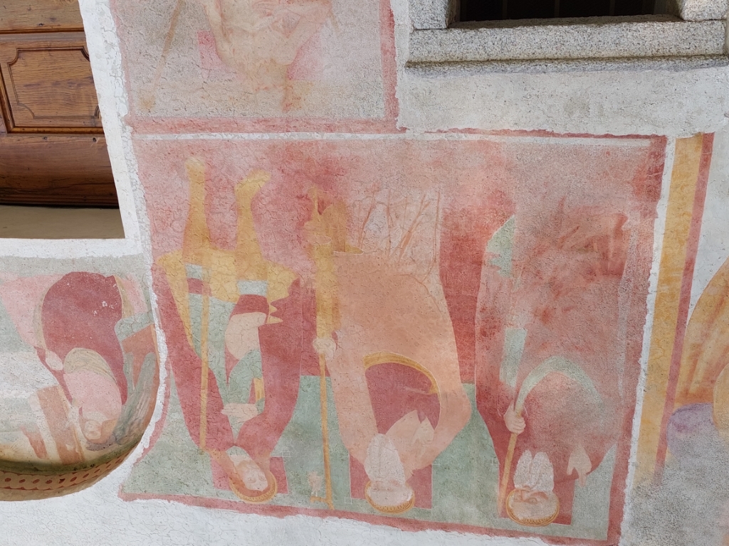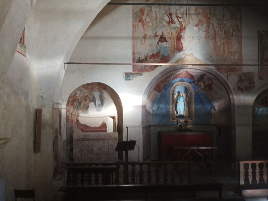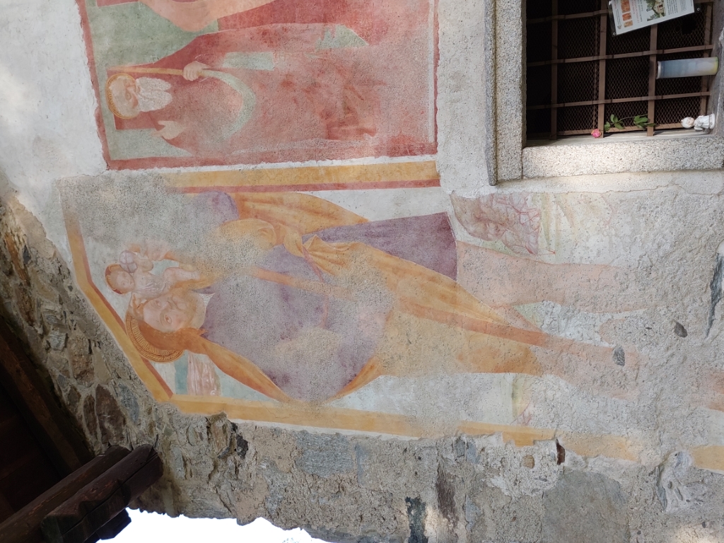 Esterno: facciata ricoperta di affreschi del '400 e '500 tra cui San Cristoforo di notevoli dimensioni, San Giulio con Sant'Antonio e San Rocco; nella lunetta Annunciazione con Santa Chiara e Santa Caterina, Maria in Trono con San Giulio e San Rocco, San Francesco con la Maddalena e la Beata Panacea. Tre interessanti absidi semicircolari si innestano su un'unica navata e sono aperte da rozze monofore e costruite in ciottoli disposti in corsi irregolari. |