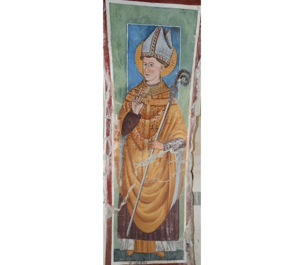 Interno: nell'abside volte a crociera con capitelli in pietra verde e affreschi raffiguranti l'annunciazione con i simboli degli Evangelisti, datati 1545. Fonte battesimale di forma ottagonale del 1450 attribuito alla scuola degli Zabreri (Costanzo, Maurizio, Stefano) attivi in quel periodo.. |