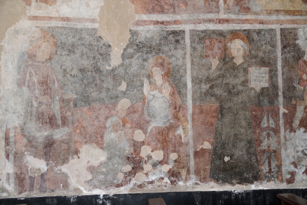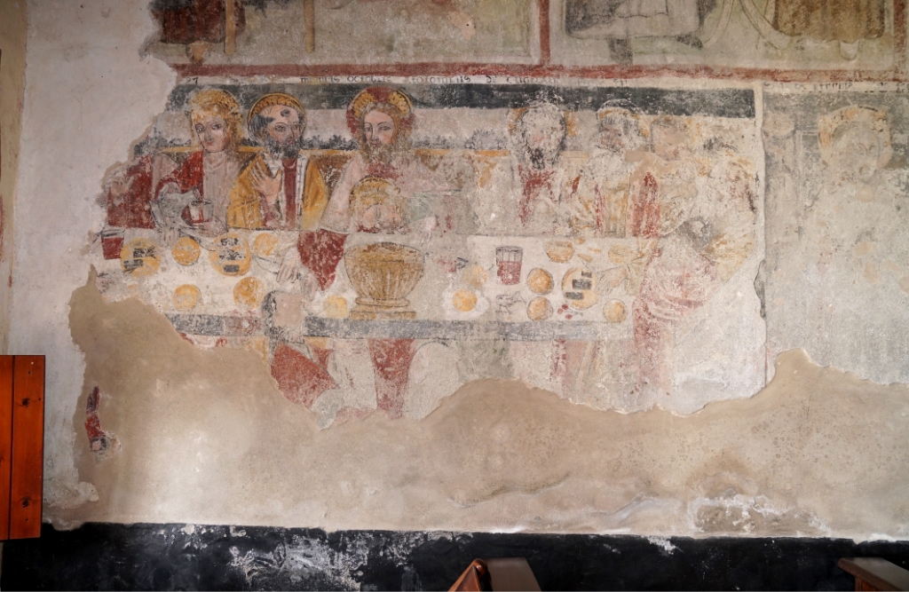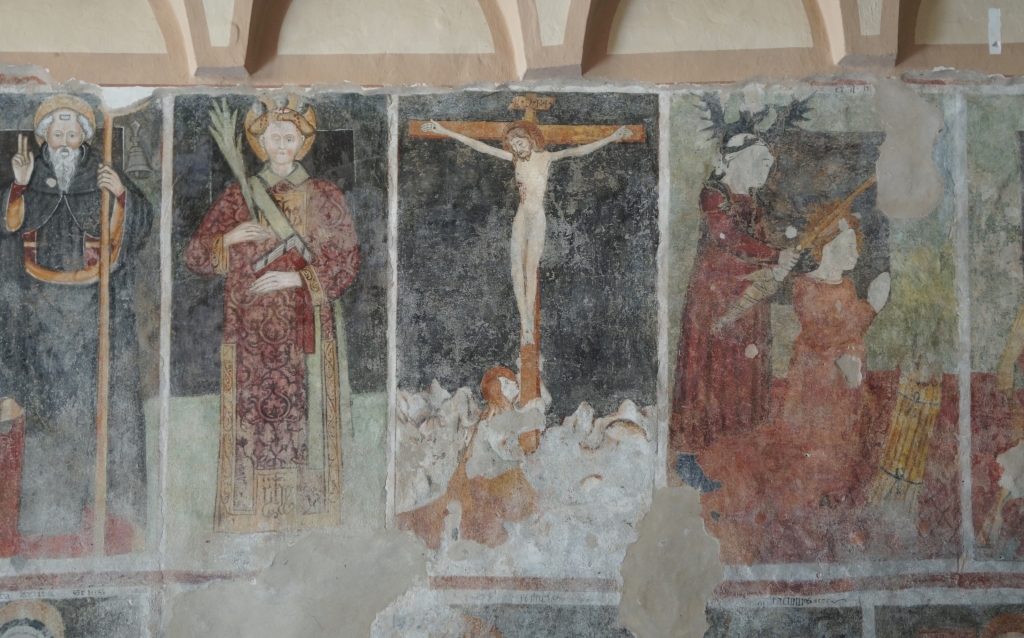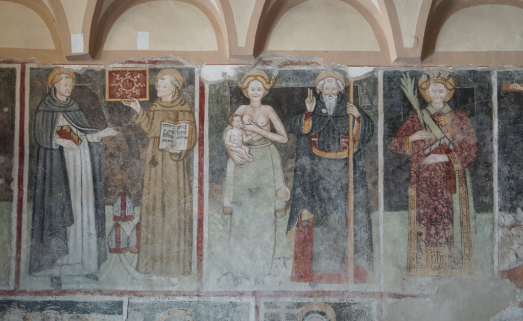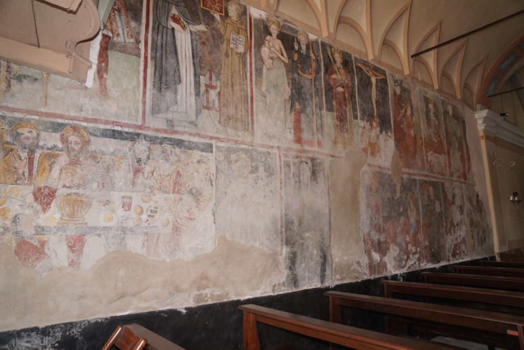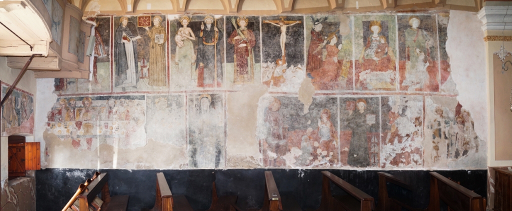 ad aula unica con affreschi alle parteti, tra cui due interessanti Madonne del latte e altri raffiguranti la Passione, Crocifissione e Resurrezione di Cristo, questi ultimi attribuiti a Bartulonus (1460 circa).. |