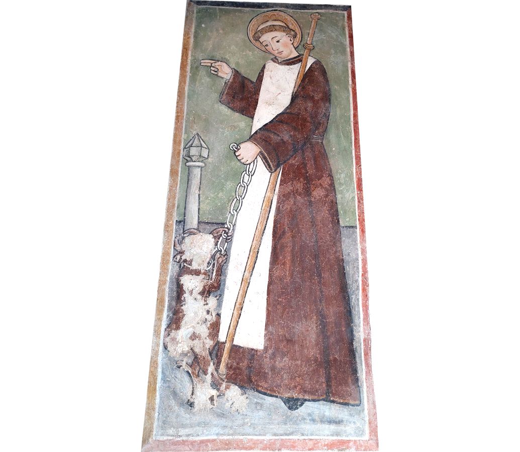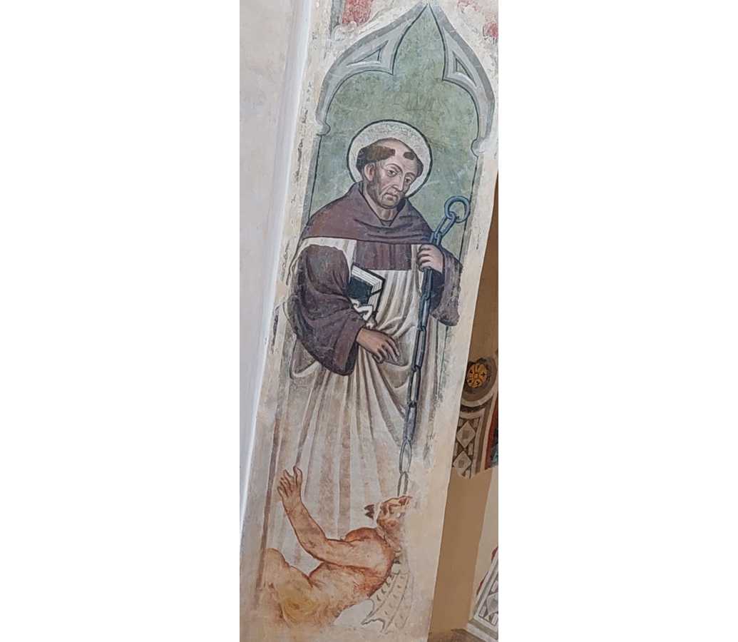 bastone dei pellegrini, demonio incatenato ai piedi, cane.