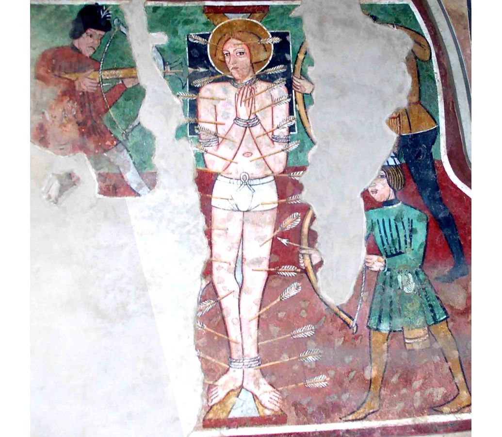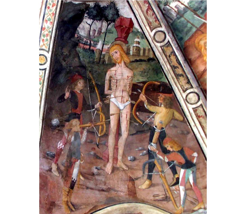 Frecce, corpo trafitto da frecce, spada, lancia, ceppo, colonna.